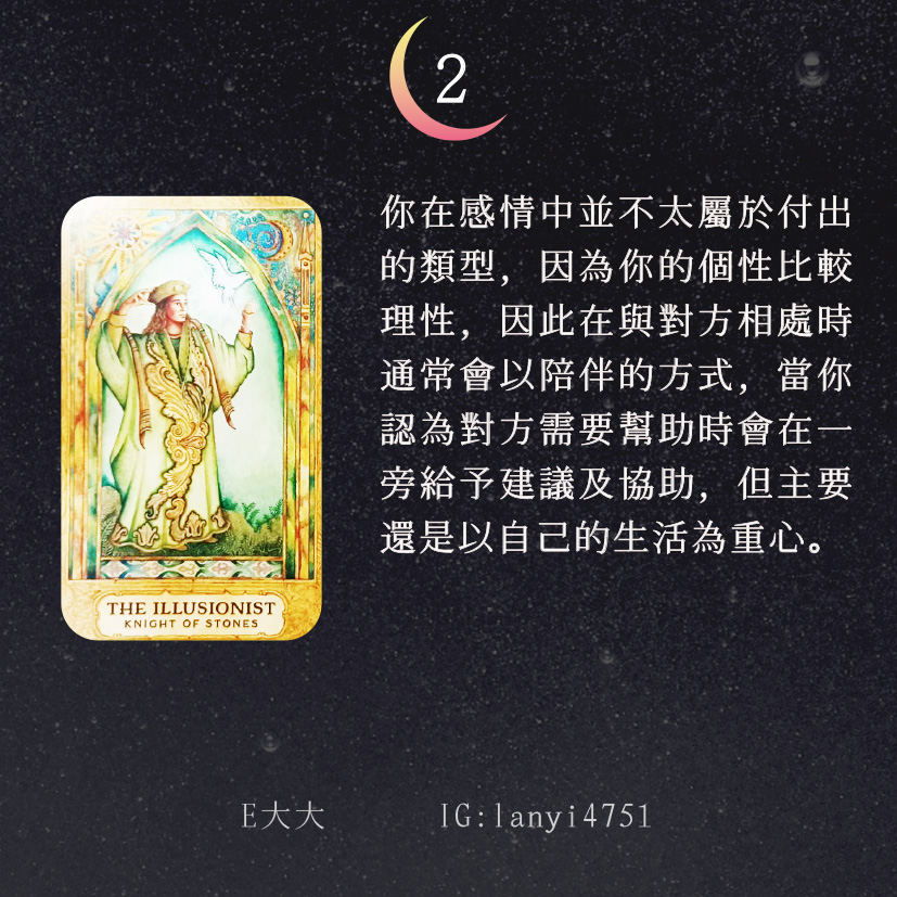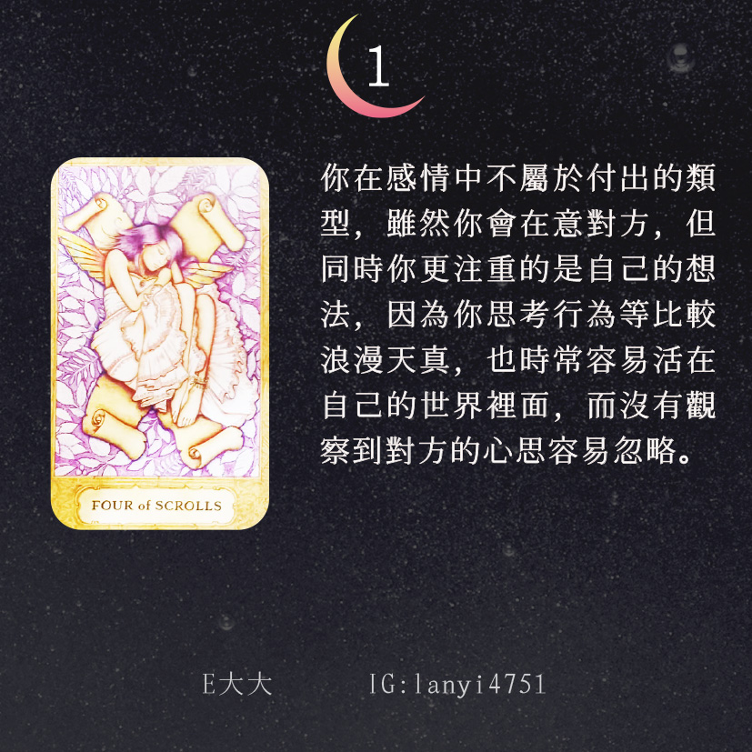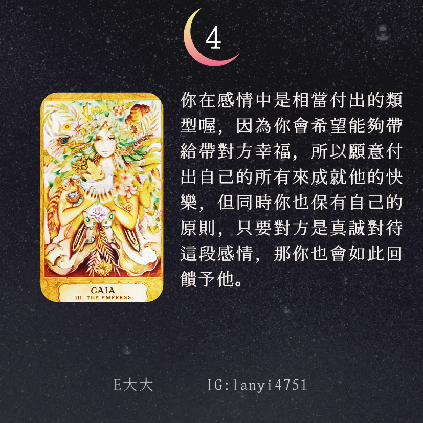 哈囉大家好嗎?我是E大大唷~直言直語的塔羅牌占卜師!偶爾也會分享多年來累積的知識及經驗,讓大家能夠更了解塔羅牌這回事。日後E大會維持每日一更大眾占卜or心理測驗(除非我太累啦😂)歡迎關注追蹤我囉!https://linktr.ee/lanyi47511