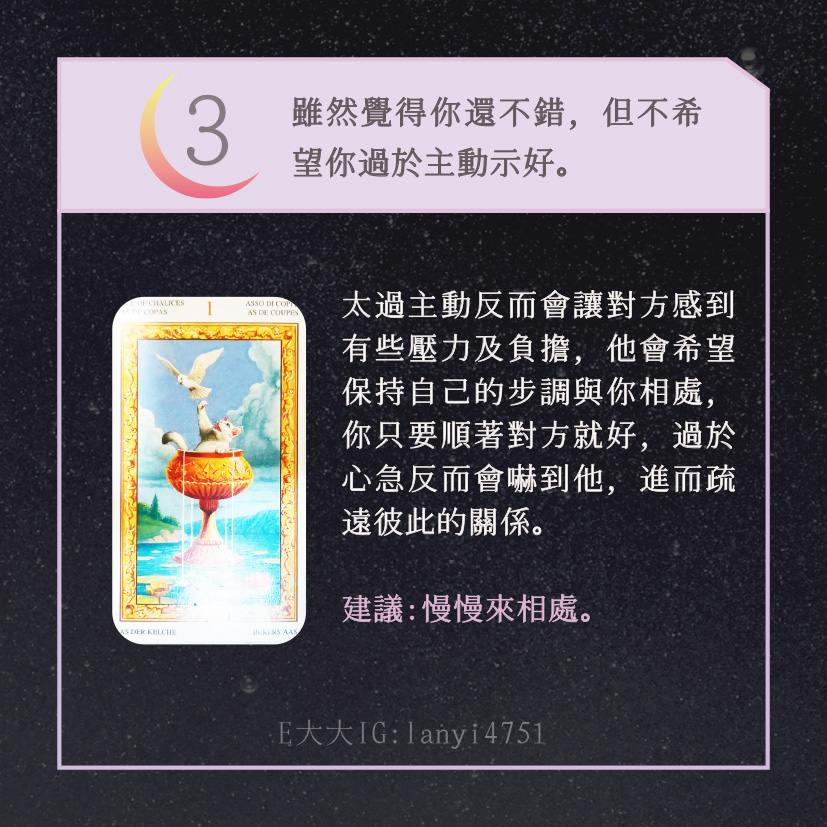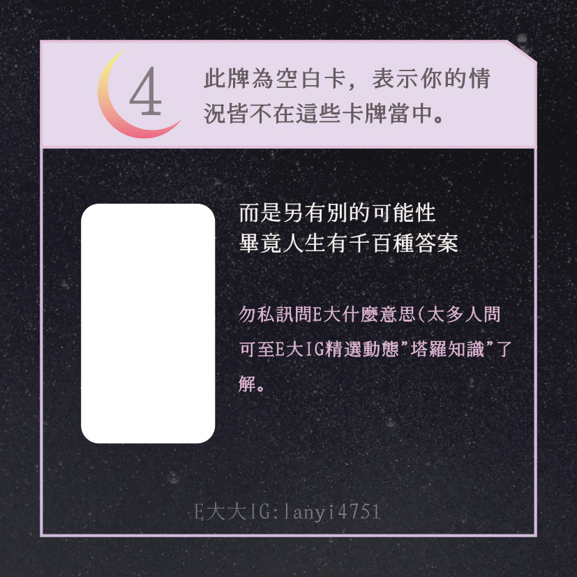 哈囉大家好嗎?我是E大大唷~直言直語的塔羅牌占卜師!偶爾也會分享多年來累積的知識及經驗,讓大家能夠更了解塔羅牌這回事。日後E大會維持每日一更大眾占卜or心理測驗(除非我太累啦😂)歡迎關注追蹤我囉!https://linktr.ee/lanyi4751