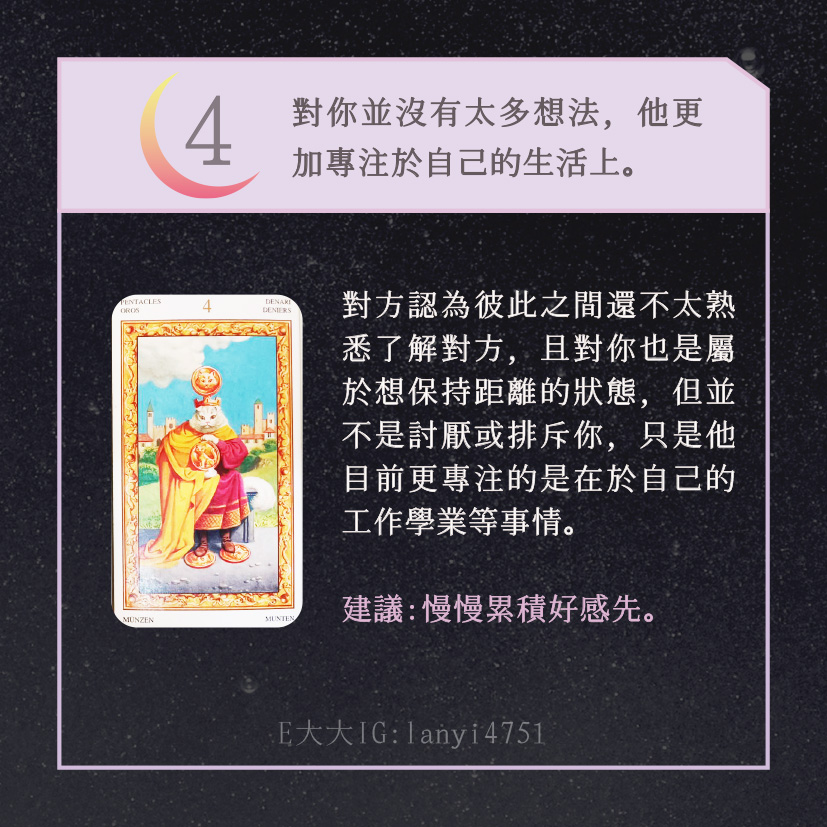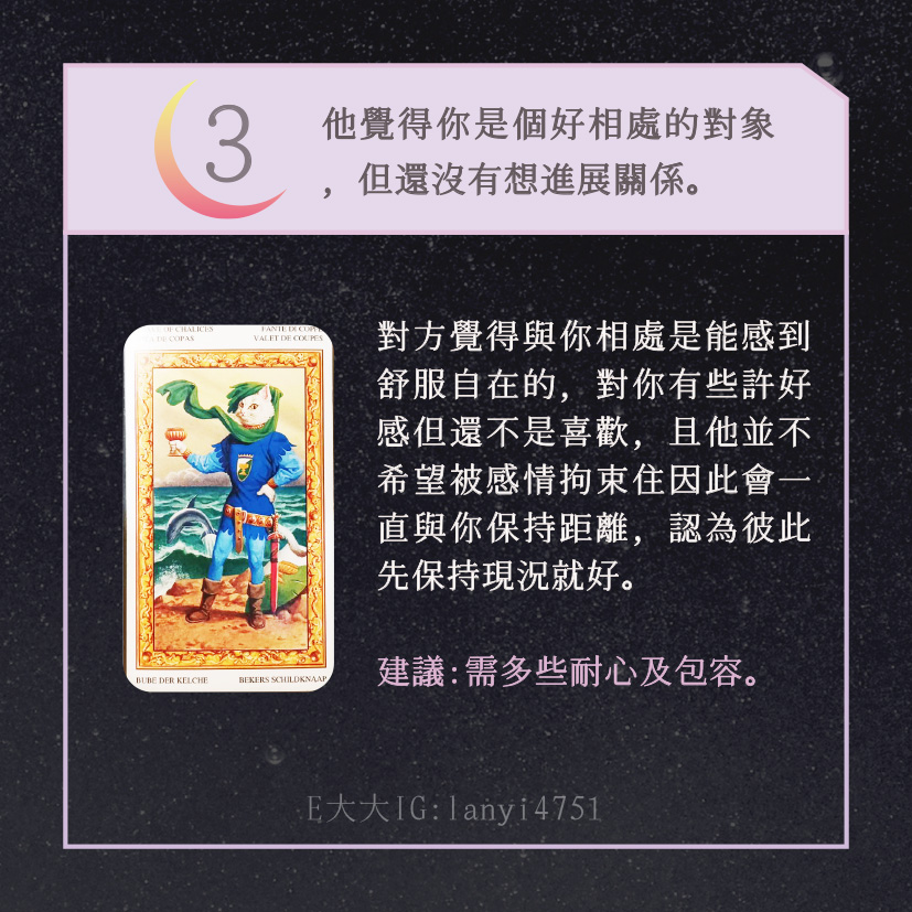 哈囉大家好嗎?我是E大大唷~直言直語的塔羅牌占卜師!偶爾也會分享多年來累積的知識及經驗,讓大家能夠更了解塔羅牌這回事。日後E大會維持每日一更大眾占卜or心理測驗(除非我太累啦😂)歡迎關注追蹤我囉!https://linktr.ee/lanyi4751