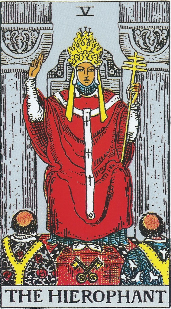 教皇身穿著紅色衣袍,服飾上白色部分有十字架,腳上是白色鞋子。頭上戴著三重王冠,三位一體,同時也代表著心靈的力量。身坐在寶座上,後面有兩根灰色的大石柱。他的右手兩指交叉表示和平,另一隻手握著權杖,意味到達更高的境界。兩個禿頂信徒跪在前面,一個身穿玫瑰圖樣衣袍,另個身穿百合花圖樣衣袍。中間是X型的鑰匙,當兩著交疊時,就會出現新的智慧道路。