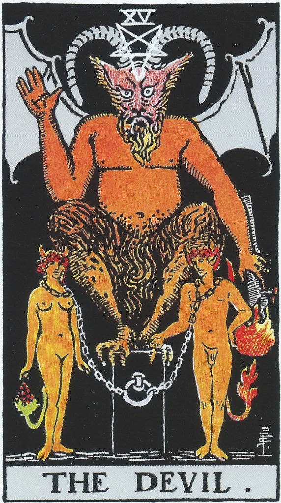 惡魔有著狼的臉頭上有羊角,背上是蝙蝠翅膀,腳則呈現鳥爪的樣子,表示著原生的動物慾望,不受控制。且他的爪子牢牢地抓在一個立柱上,立柱象徵著另一個空間層次。而下方出現了與戀人牌相像的人物,他們身上有著角及尾巴,是惡魔慾望的象徵。亞當與夏娃已脫離了天堂的世界,不再過去那般純潔善良,兩人之間還被一條鎖鏈套住,彼此牽制著對方難以前行。