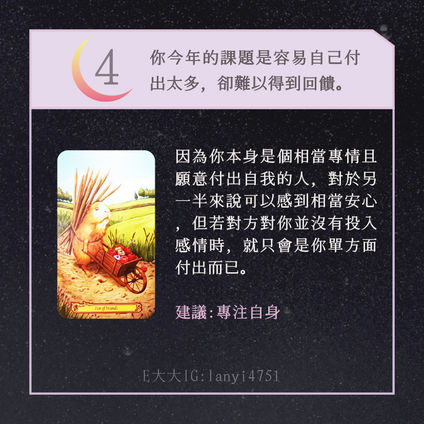 嗨~我是E大,歡迎你來到我的塔羅世界,創立這個平台主要是為了讓更多人對塔羅牌產生興趣,並且能透過牌卡找到自己人生方向。歡迎關注追蹤我囉!https://linktr.ee/lanyi4751