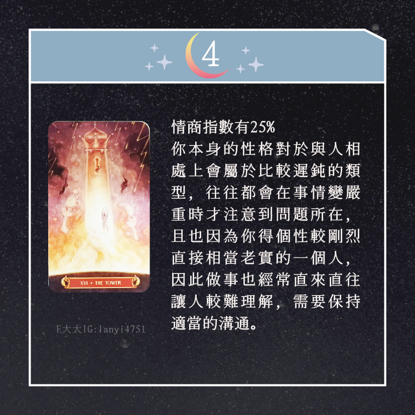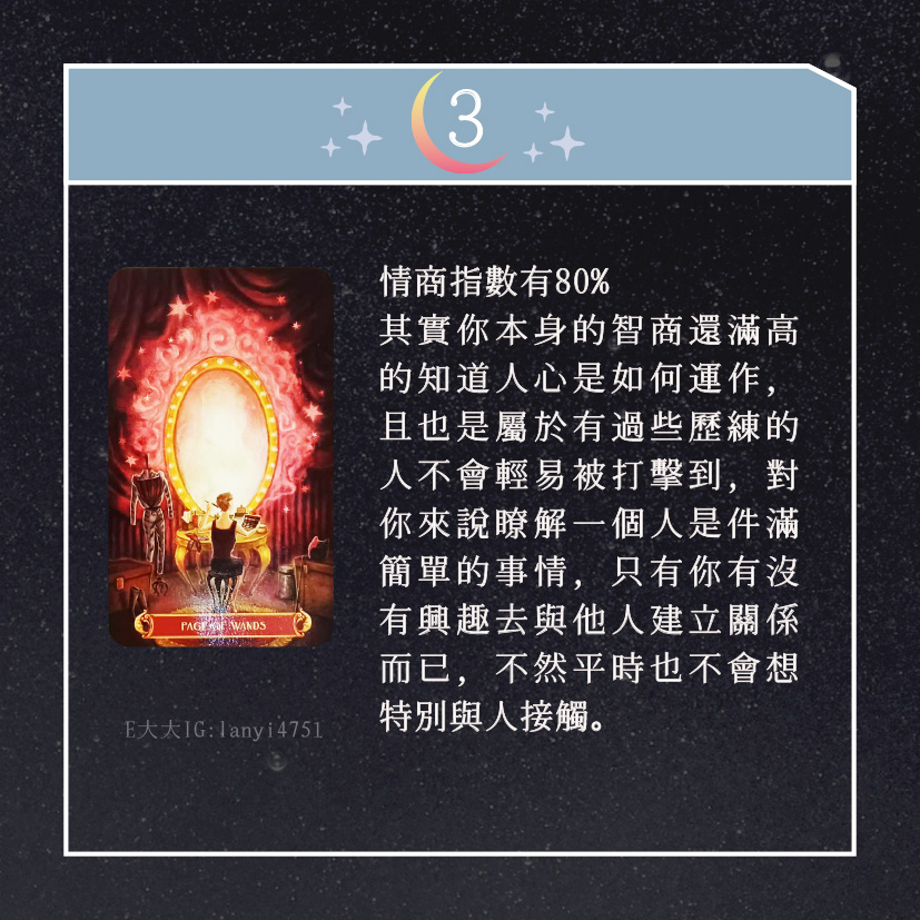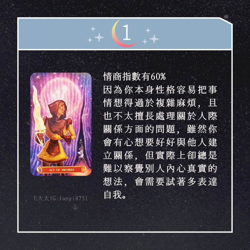 嗨~我是E大,歡迎你來到我的塔羅世界,創立這個平台主要是為了讓更多人對塔羅牌產生興趣,並且能透過牌卡找到自己人生方向。歡迎關注追蹤我囉!https://linktr.ee/lanyi4751
