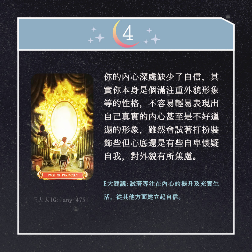 嗨~我是E大,歡迎你來到我的塔羅世界,創立這個平台主要是為了讓更多人對塔羅牌產生興趣,並且能透過牌卡找到自己人生方向。歡迎關注追蹤我囉!https://linktr.ee/lanyi4751