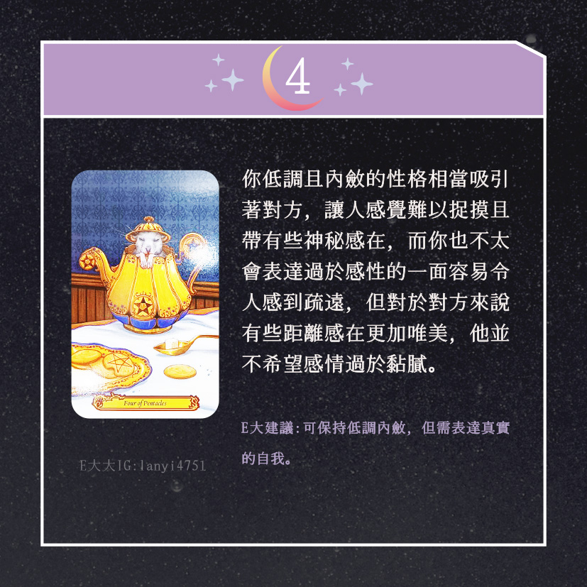 嗨~我是E大,歡迎你來到我的塔羅世界,創立這個平台主要是為了讓更多人對塔羅牌產生興趣,並且能透過牌卡找到自己人生方向。歡迎關注追蹤我囉!https://linktr.ee/lanyi4751