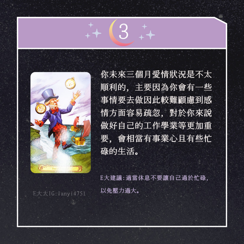 嗨~我是E大,歡迎你來到我的塔羅世界,創立這個平台主要是為了讓更多人對塔羅牌產生興趣,並且能透過牌卡找到自己人生方向。歡迎關注追蹤我囉!https://linktr.ee/lanyi4751
