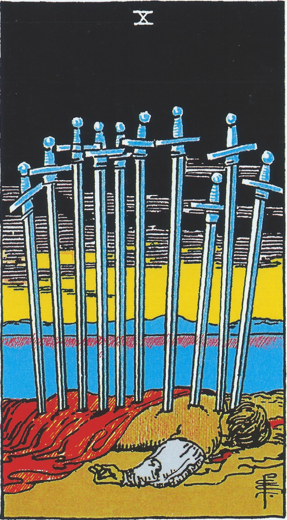 有個人躺在地上,身上披著紅色布塊,象徵著內心的慾望。背後插了十把劍,看起來他已經無法承受,這對他來說過於痛苦,內心是相當挫折絕望的。天空上出現黑雲,意味著他將被黑暗壟罩,生命當中充滿著艱辛。烏雲後是黃色的天空,象徵著一線生機,就算黑暗來臨也可能脫困重生。