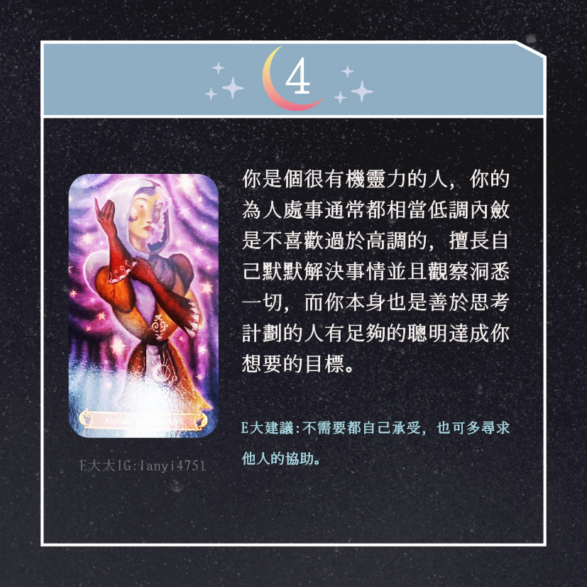嗨~我是E大,歡迎你來到我的塔羅世界,創立這個平台主要是為了讓更多人對塔羅牌產生興趣,並且能透過牌卡找到自己人生方向。歡迎關注追蹤我囉!https://linktr.ee/lanyi4751