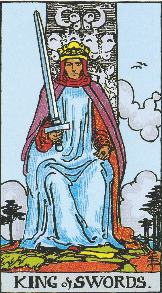 有一個男人坐在石椅上,椅子上刻有蝴蝶的圖案,象徵靈魂的自由。他手上拿著一把劍,代表著力量。頭上戴著皇冠,象徵著擁有的權力。身上披著紅色的披風,意味著熱情。身穿水藍色的衣袍,代表著他潛意識中的理性,不會隨意被他人影響,看得相當通透。土地上有些樹木及草皮,天上的兩隻鳥象徵智慧及行動。