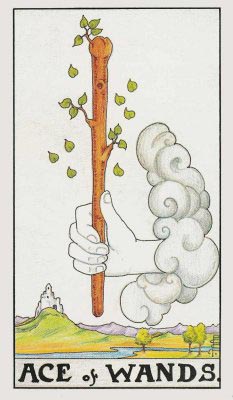 有一隻手從雲中出來,象徵他是來自天上的安排。手上拿著一隻權杖,權杖上長了些許綠葉,意味著無限的可能性,飛落的葉子象徵不受拘束限制,自由發揮自己的能力,開始創造新的機會。後方有乾淨的河川及山脈,意味著機緣生生不息,總是找的到更多的資源,幫助你完成自己的目標。