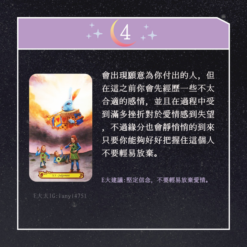 嗨~我是E大,歡迎你來到我的塔羅世界,創立這個平台主要是為了讓更多人對塔羅牌產生興趣,並且能透過牌卡找到自己人生方向。歡迎關注追蹤我囉!https://linktr.ee/lanyi4751