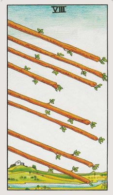 有八根權杖劃過天際,看起來方向一致,有同樣的目標正往前邁進,事情會相當迅速的完成。後方有著小河及山脈,意味著資源相當多,物資豐饒。山上還有間房子,象徵安穩和諧,事情能夠順利的進展。綠色的草地擁有好的意味,帶來生生不息。白藍色的天空意味內心的潛意識相當平靜。