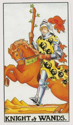 有一個騎士身穿著盔甲,意味著他有所準備而來,盔甲上有著紅色的毛髮,象徵慾望及熱忱。他手上拿著權杖,象徵擁有的權力。穿上穿著一件破爛的衣服,有著蜥蜴的圖案,意味著他內心的成熟及思考周全,能夠做出對的決策。他騎著馬往前衝刺,後方是沙漠及山脈,意味著前方會有所重重挑戰。