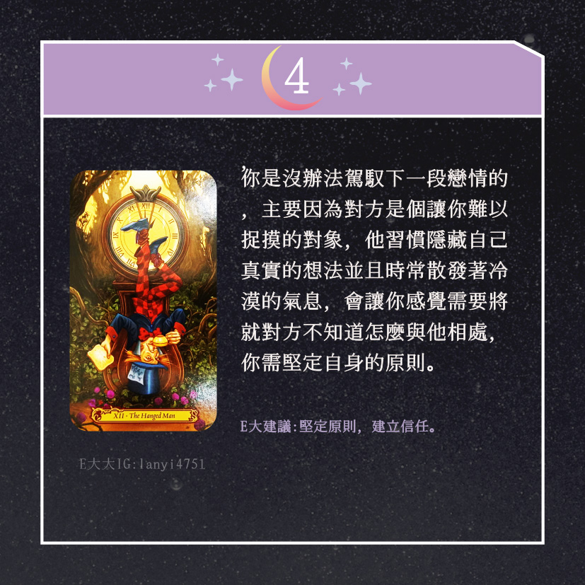 嗨~我是E大,歡迎你來到我的塔羅世界,創立這個平台主要是為了讓更多人對塔羅牌產生興趣,並且能透過牌卡找到自己人生方向。歡迎關注追蹤我囉!https://linktr.ee/lanyi4751