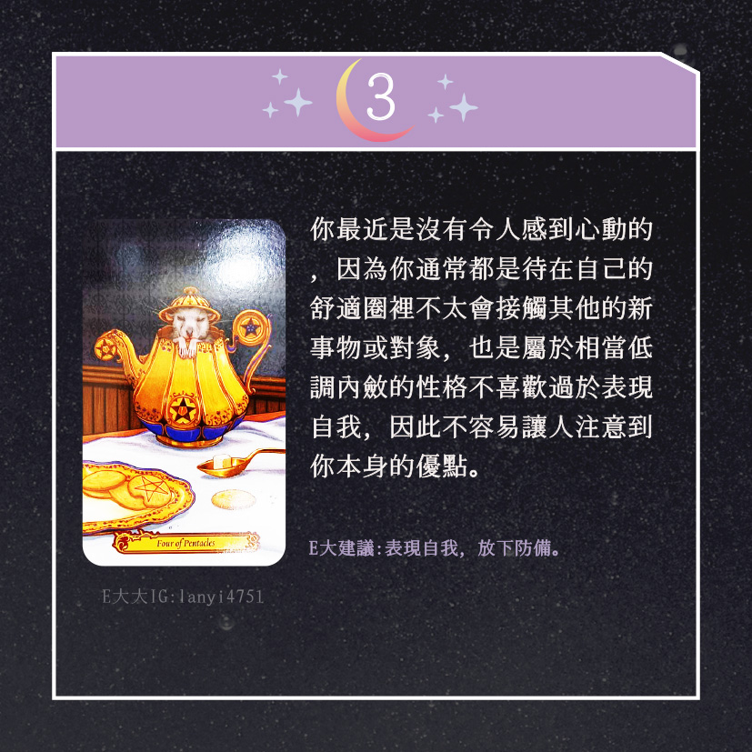 嗨~我是E大,歡迎你來到我的塔羅世界,創立這個平台主要是為了讓更多人對塔羅牌產生興趣,並且能透過牌卡找到自己人生方向。歡迎關注追蹤我囉!https://linktr.ee/lanyi4751