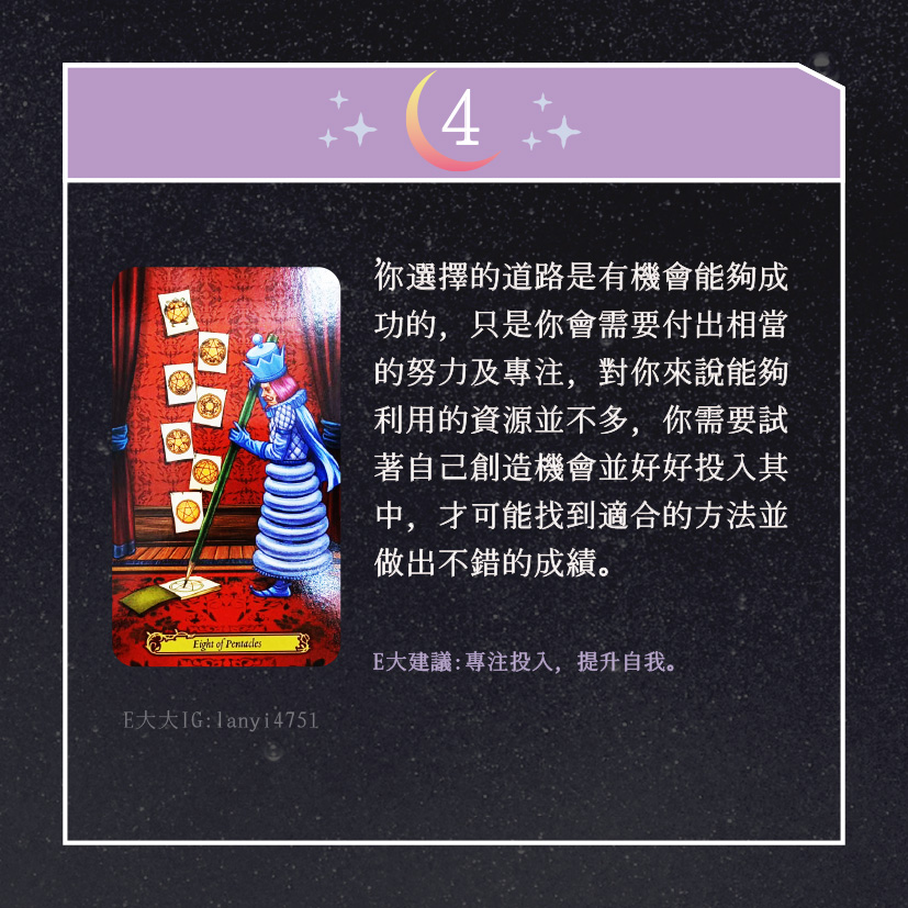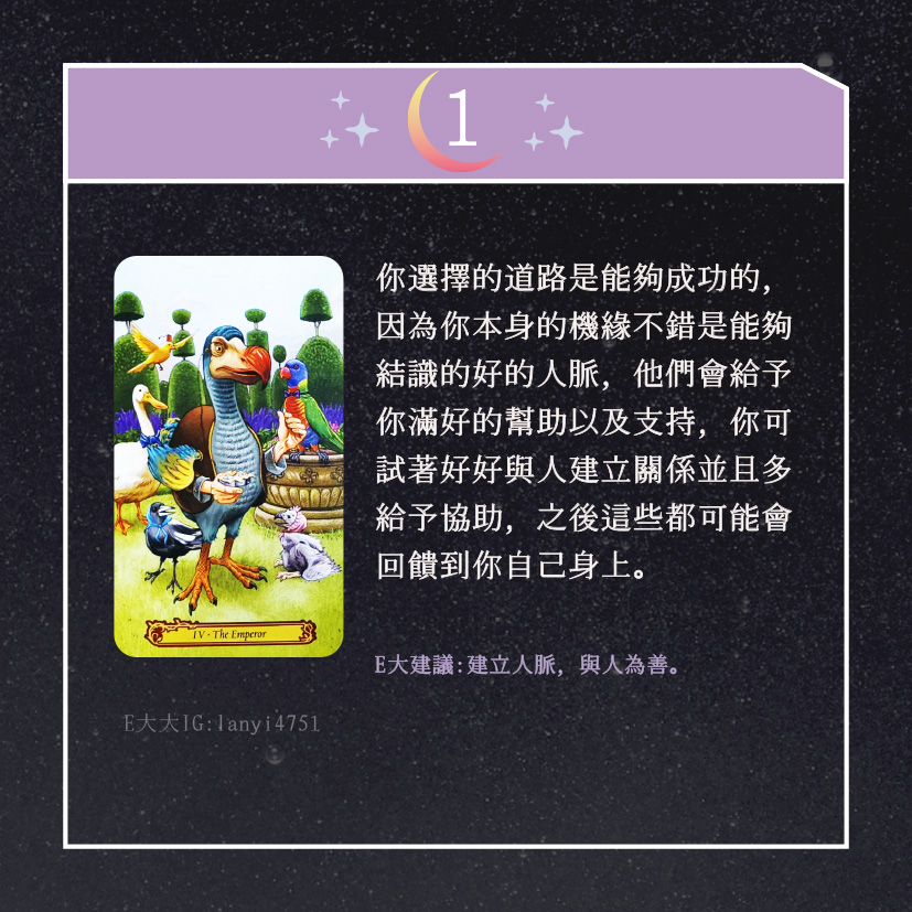嗨~我是E大,歡迎你來到我的塔羅世界,創立這個平台主要是為了讓更多人對塔羅牌產生興趣,並且能透過牌卡找到自己人生方向。歡迎關注追蹤我囉!https://linktr.ee/lanyi4751