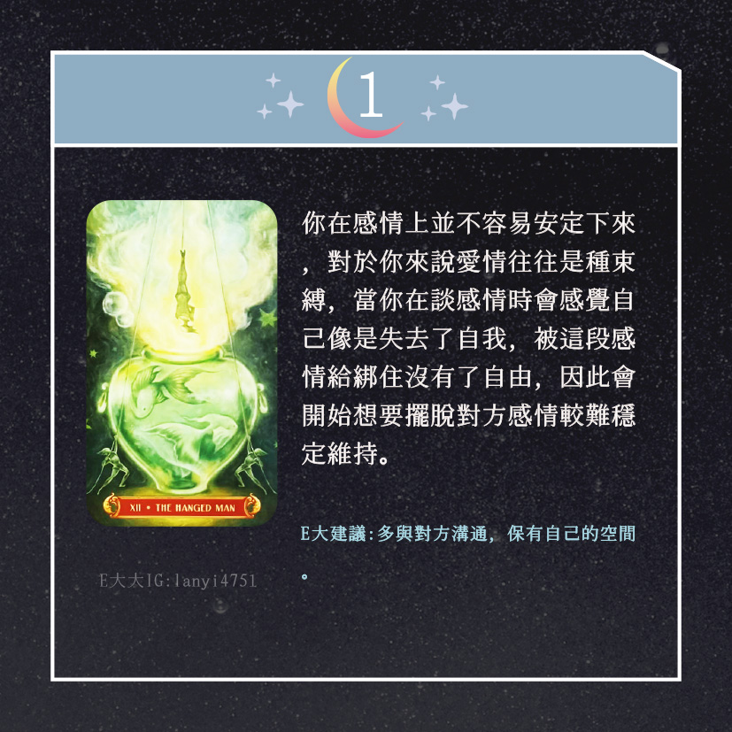 嗨~我是E大,歡迎你來到我的塔羅世界,創立這個平台主要是為了讓更多人對塔羅牌產生興趣,並且能透過牌卡找到自己人生方向。歡迎關注追蹤我囉!https://linktr.ee/lanyi4751