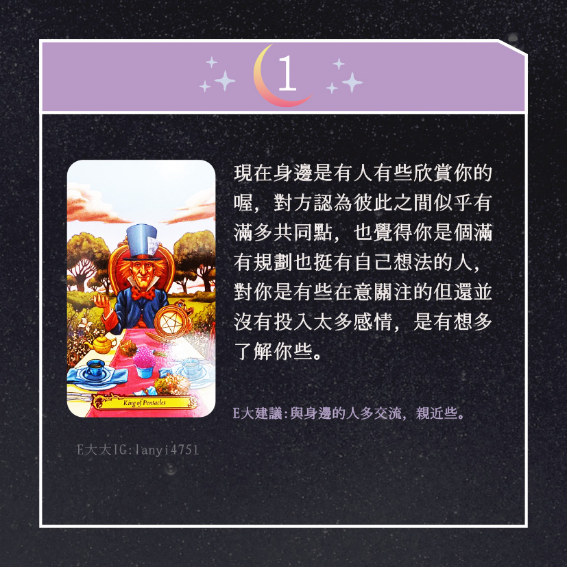 嗨~我是E大,歡迎你來到我的塔羅世界,每天會跟大家分享有趣的塔牌測驗,及塔羅知識喔!
