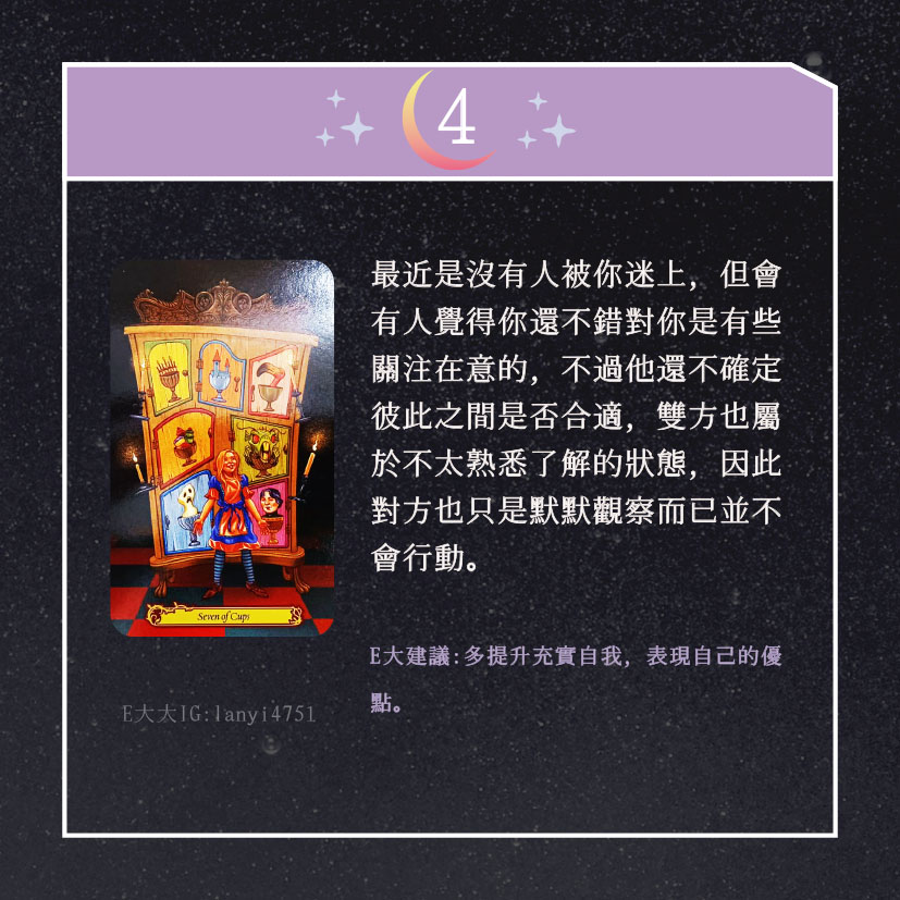 嗨~我是E大,歡迎你來到我的塔羅世界,創立這個平台主要是為了讓更多人對塔羅牌產生興趣,並且能透過牌卡找到自己人生方向。歡迎關注追蹤我囉!https://linktr.ee/lanyi4751