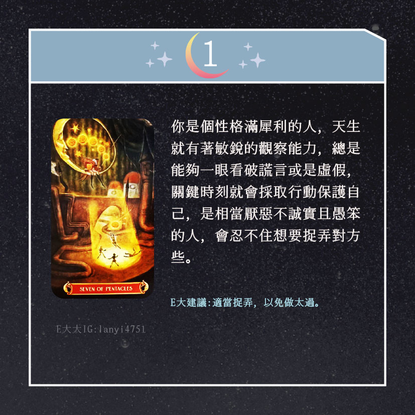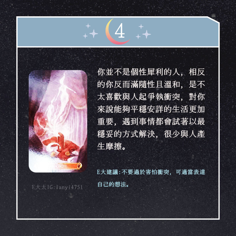 嗨~我是E大,歡迎你來到我的塔羅世界,創立這個平台主要是為了讓更多人對塔羅牌產生興趣,並且能透過牌卡找到自己人生方向。歡迎關注追蹤我囉!https://linktr.ee/lanyi4751
