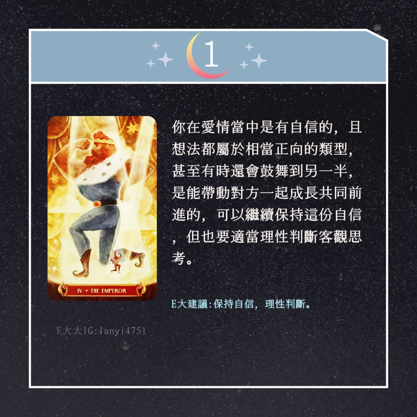 嗨~我是E大,歡迎你來到我的塔羅世界,每天會跟大家分享有趣的塔牌測驗,及塔羅知識喔!