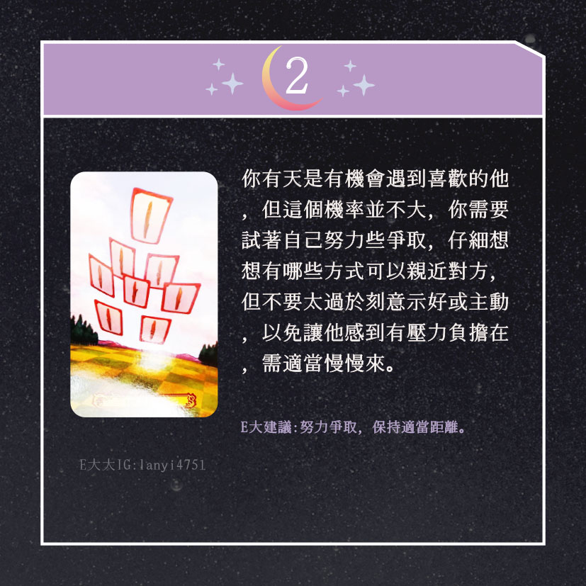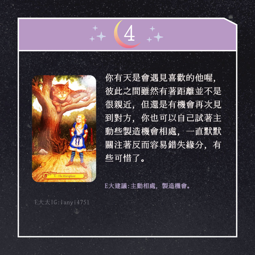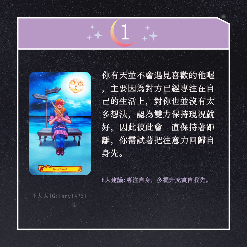 嗨~我是E大,歡迎你來到我的塔羅世界,每天會跟大家分享有趣的塔牌測驗,及塔羅知識喔!