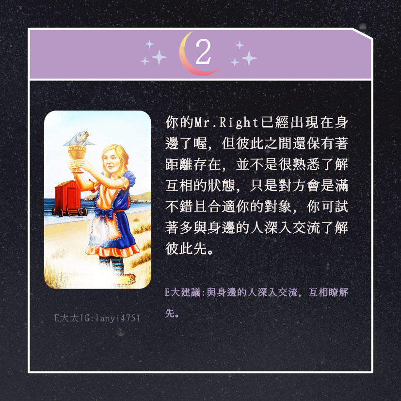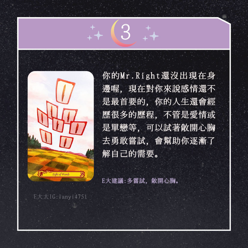 嗨~我是E大,歡迎你來到我的塔羅世界,每天會跟大家分享有趣的塔牌測驗,及塔羅知識喔!