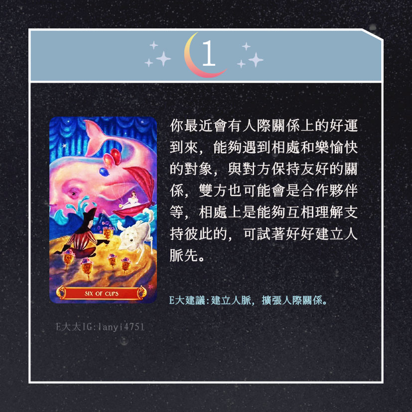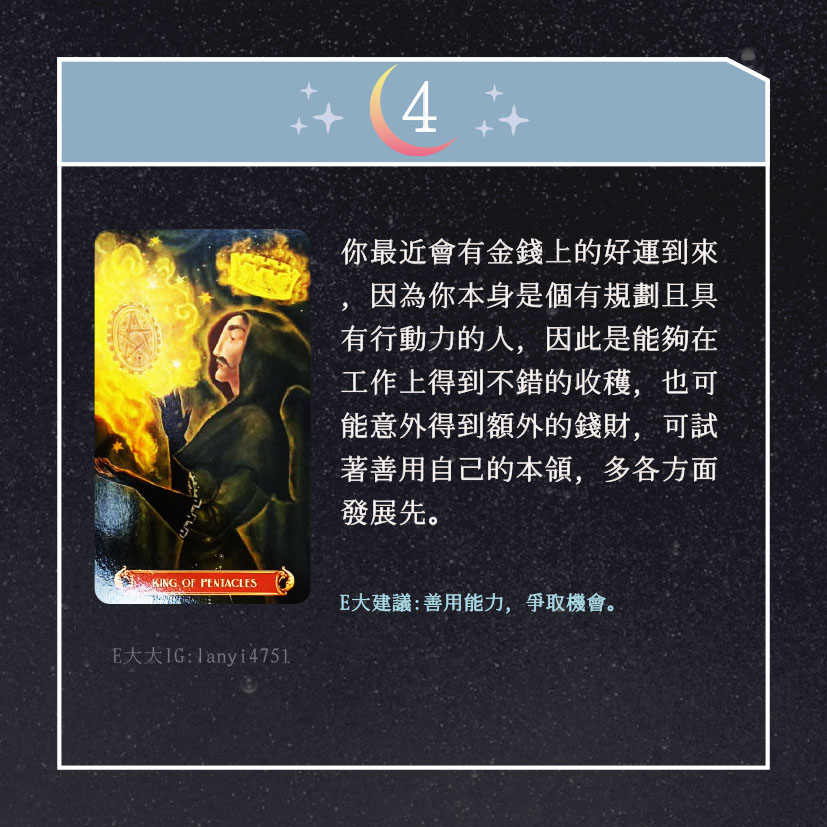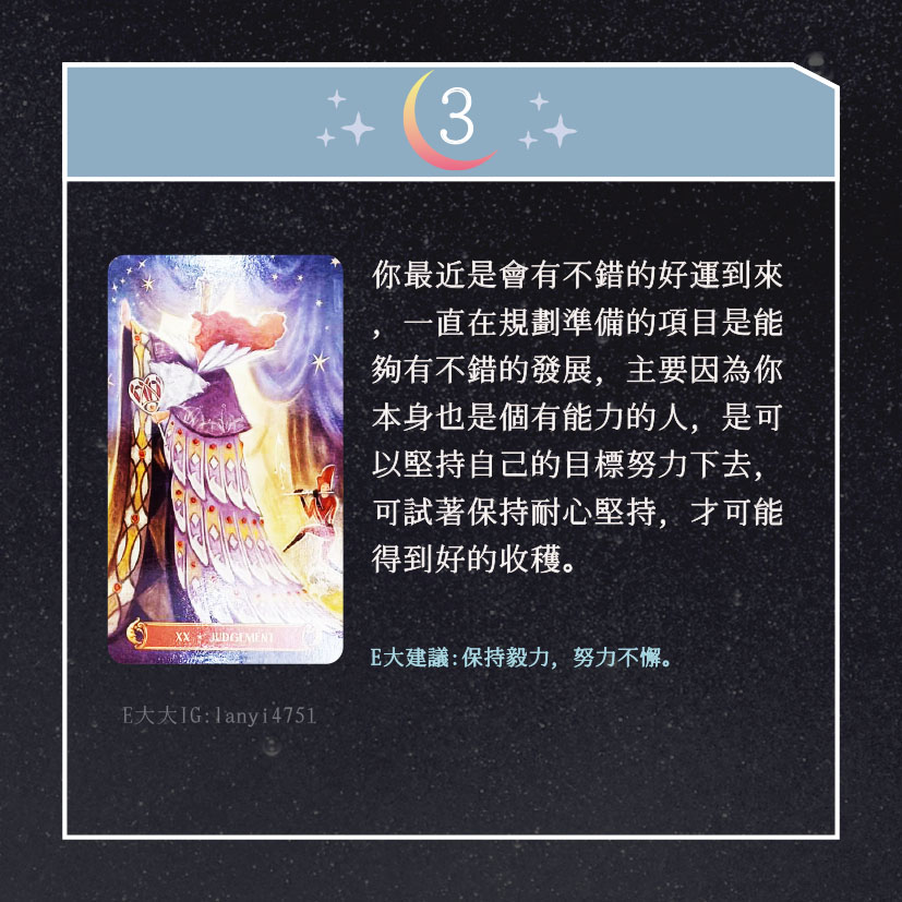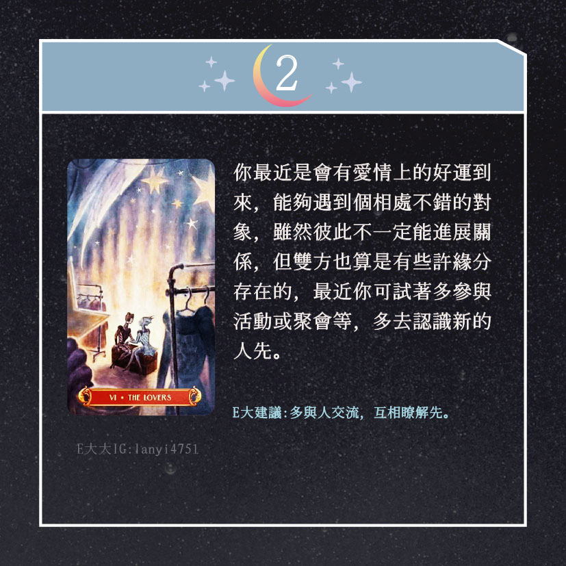 嗨~我是E大,歡迎你來到我的塔羅世界,每天會跟大家分享有趣的塔牌測驗,及塔羅知識喔!
