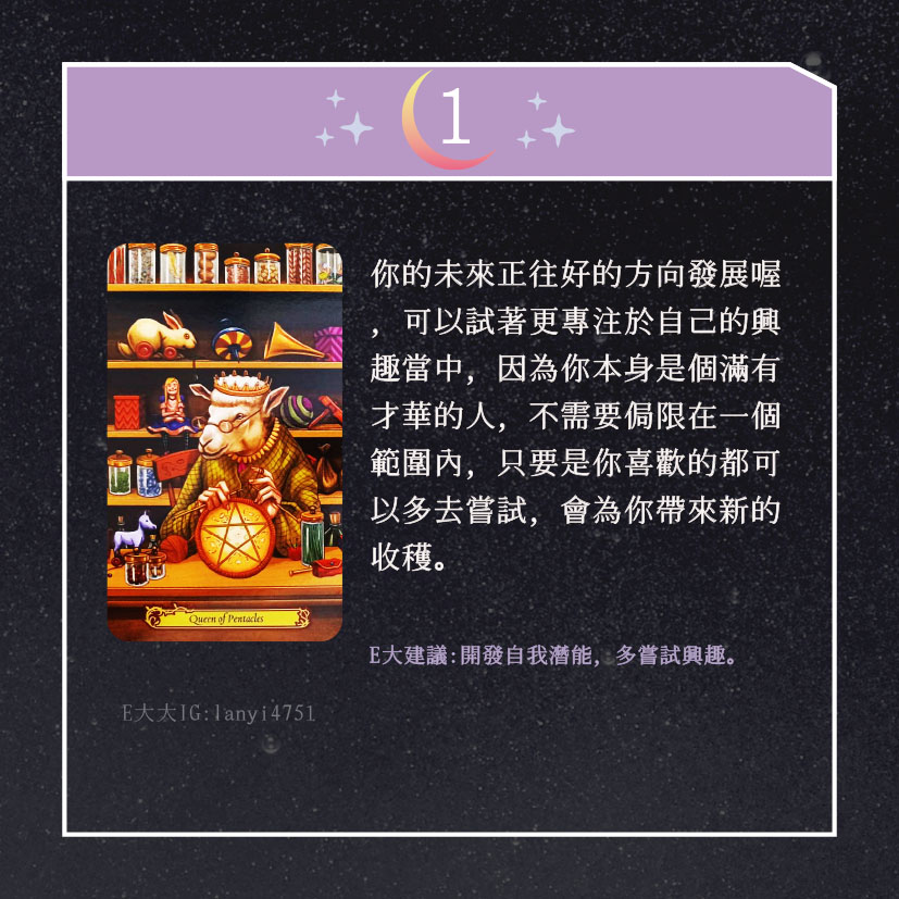 嗨~我是E大,歡迎你來到我的塔羅世界,每天會跟大家分享有趣的塔牌測驗,及塔羅知識喔!