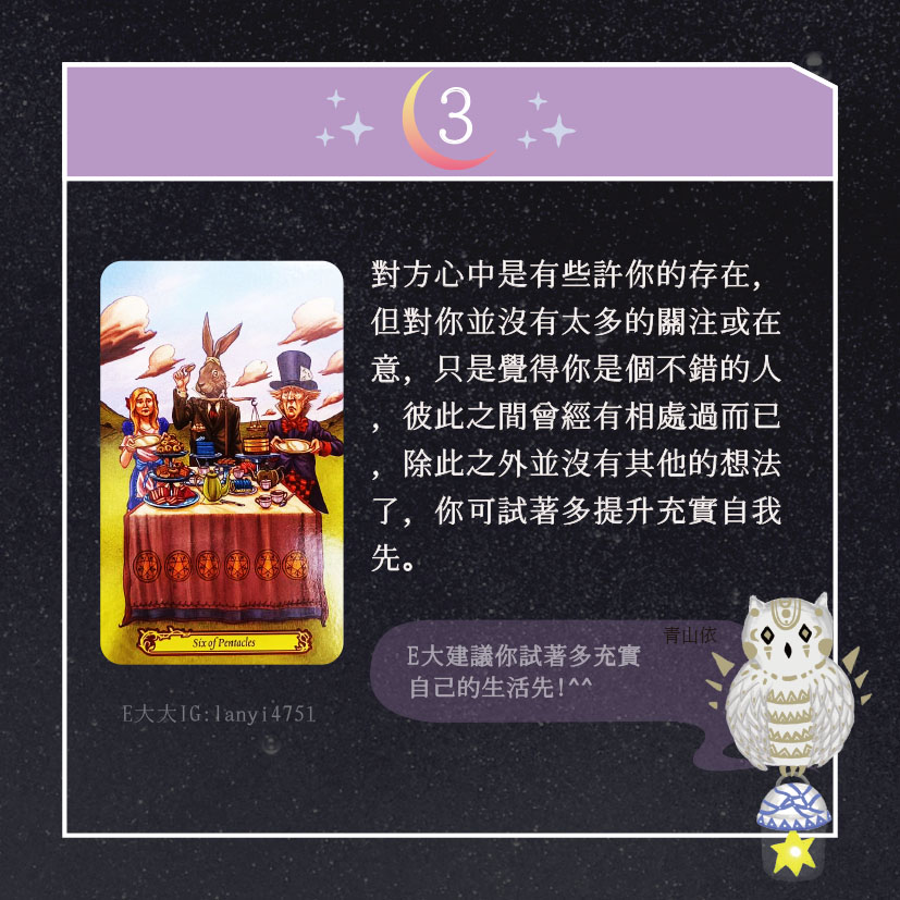 嗨~我是E大,歡迎你來到我的塔羅世界,每天會跟大家分享有趣的塔牌測驗,及塔羅知識喔!