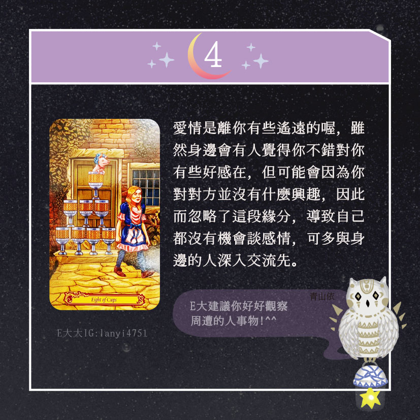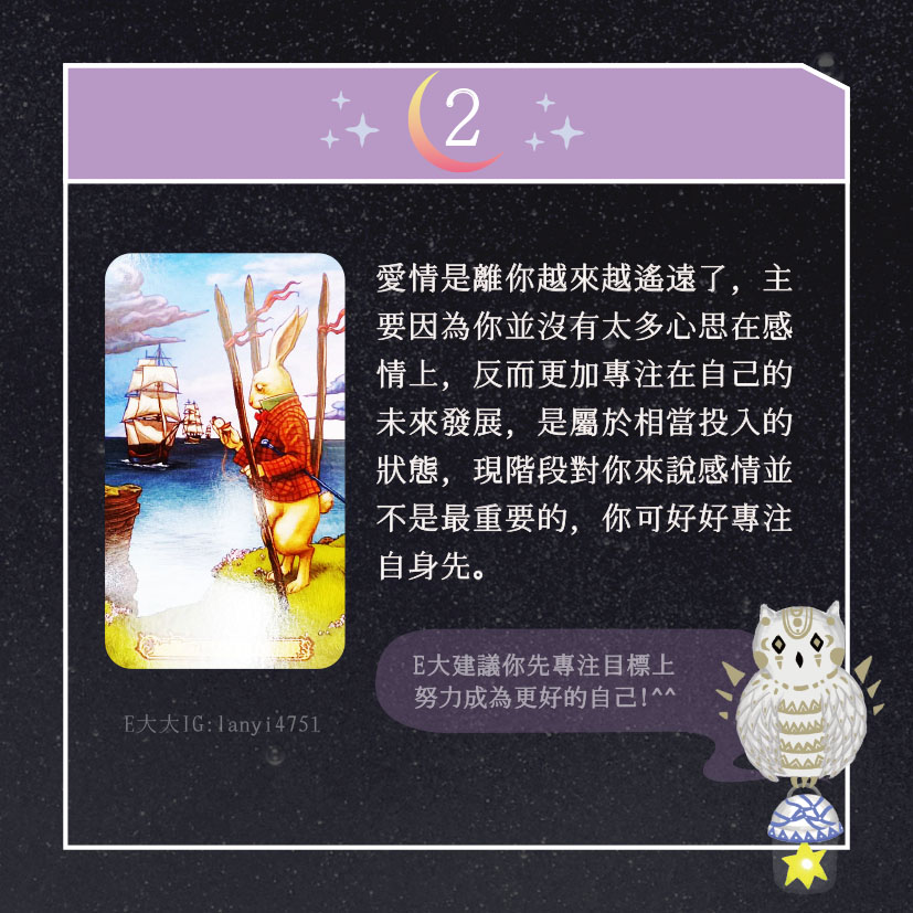 嗨~我是E大,歡迎你來到我的塔羅世界,每天會跟大家分享有趣的塔牌測驗,及塔羅知識喔!