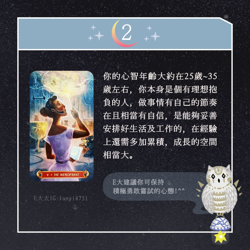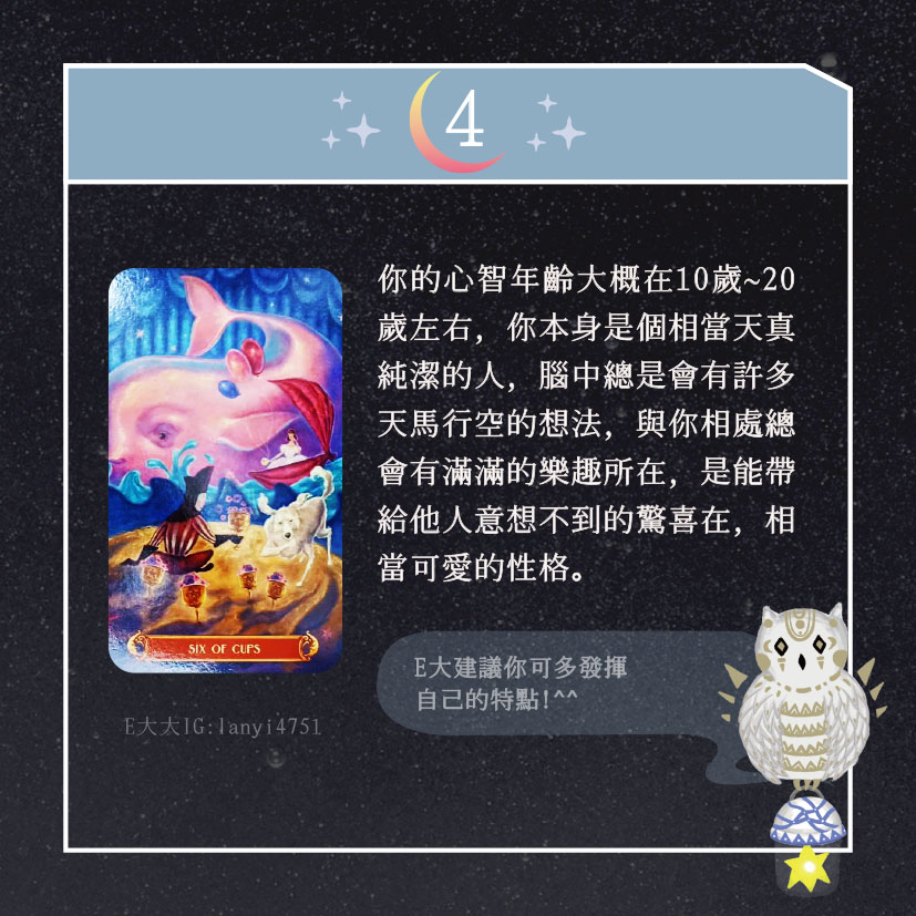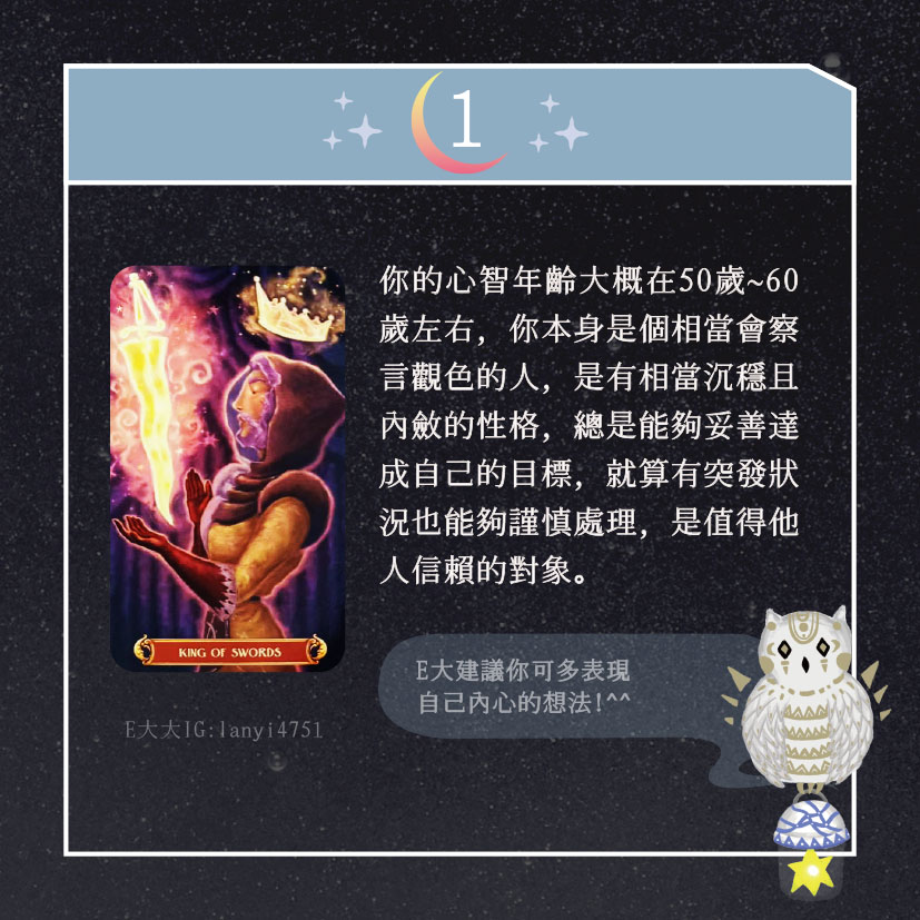 嗨~我是E大,歡迎你來到我的塔羅世界,每天會跟大家分享有趣的塔牌測驗,及塔羅知識喔!