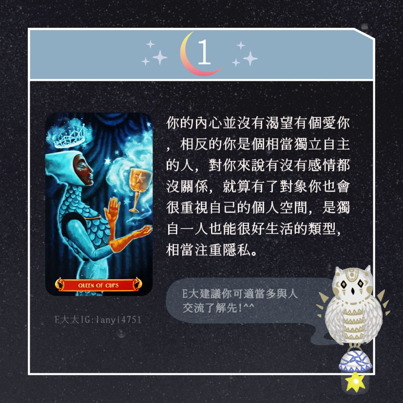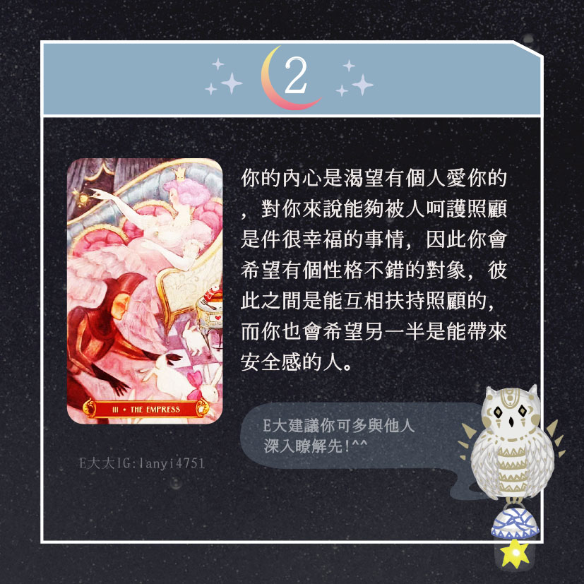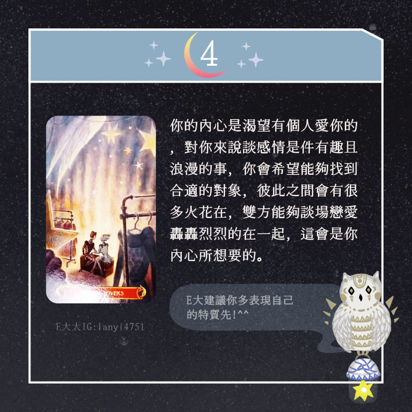 嗨~我是E大,歡迎你來到我的塔羅世界,每天會跟大家分享有趣的塔牌測驗,及塔羅知識喔!