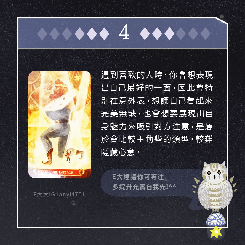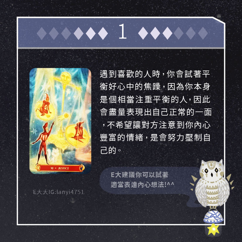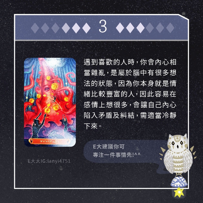 嗨~我是E大,歡迎你來到我的塔羅世界,每天會跟大家分享有趣的塔牌測驗,及塔羅知識喔!