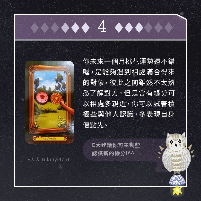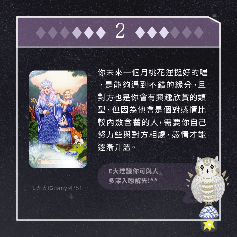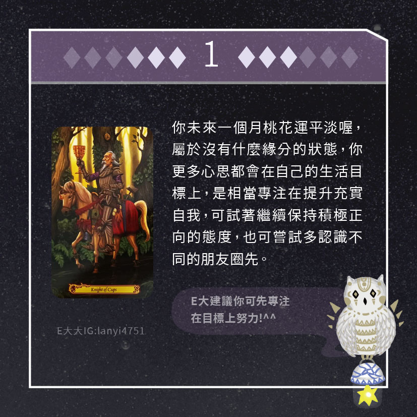 嗨~我是E大,歡迎你來到我的塔羅世界,每天會跟大家分享有趣的塔牌測驗,及塔羅知識喔!