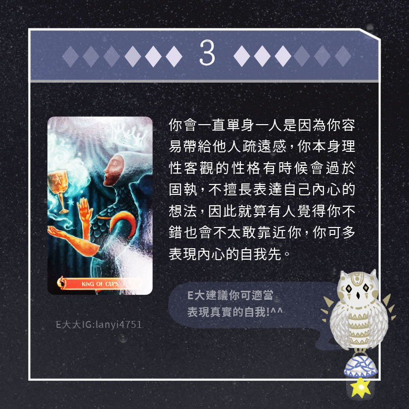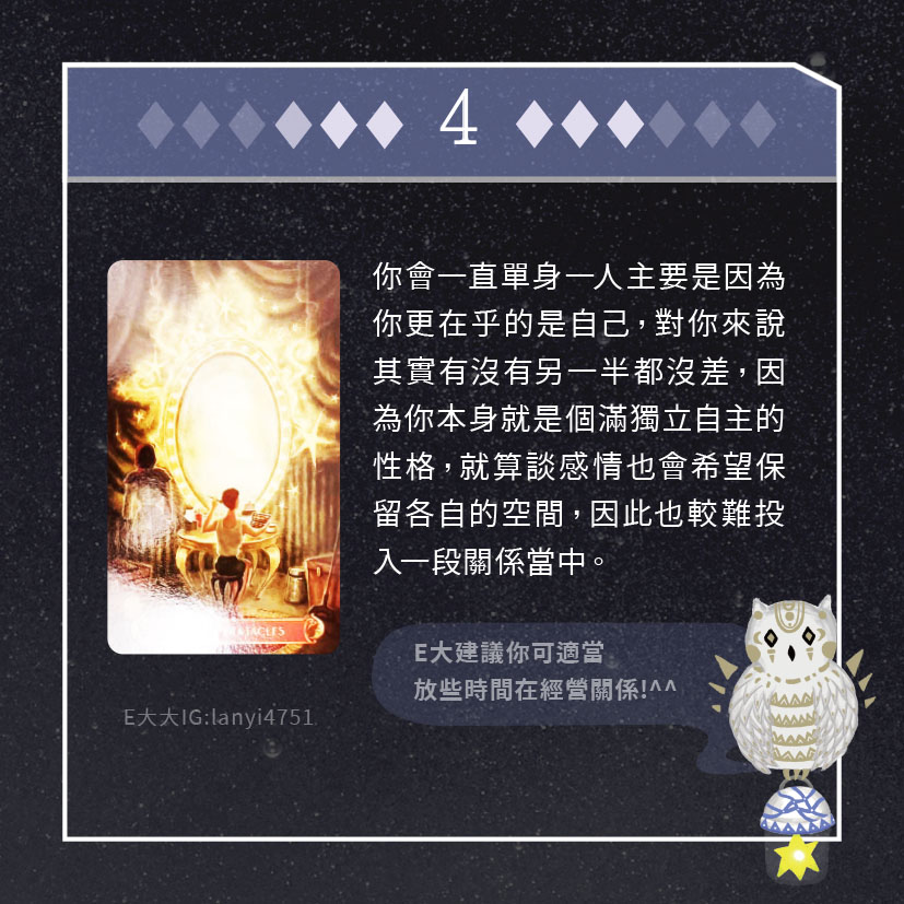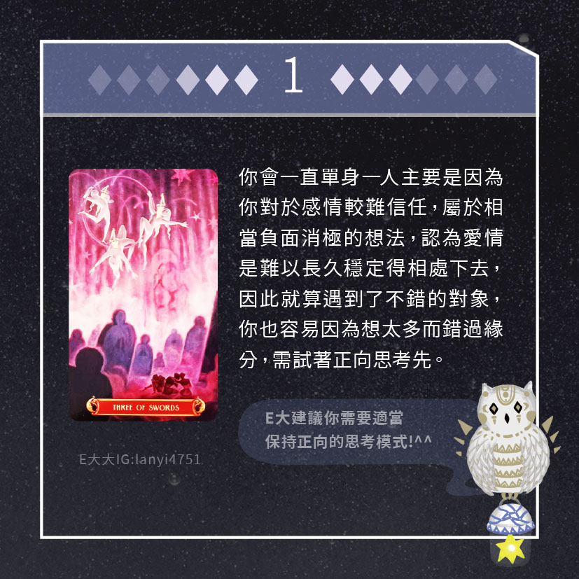 嗨~我是E大,歡迎你來到我的塔羅世界,每天會跟大家分享有趣的塔牌測驗,及塔羅知識喔!