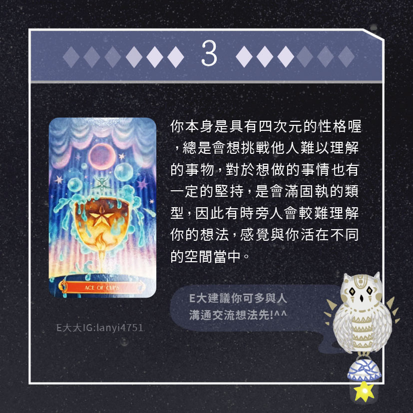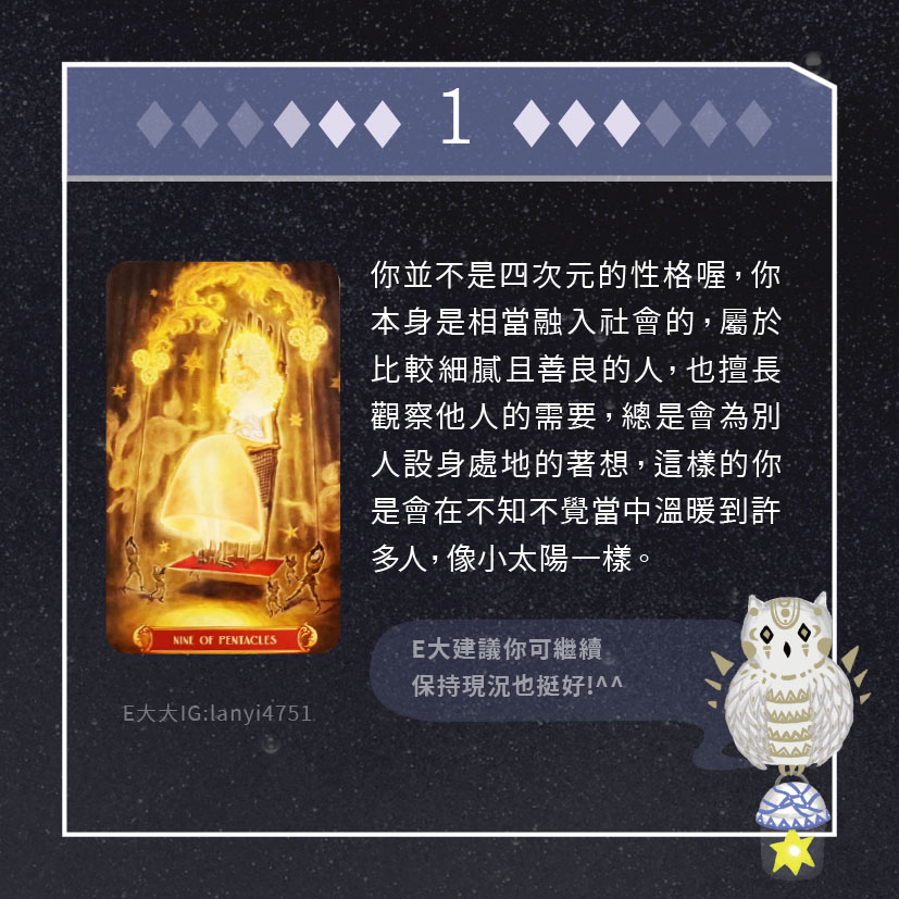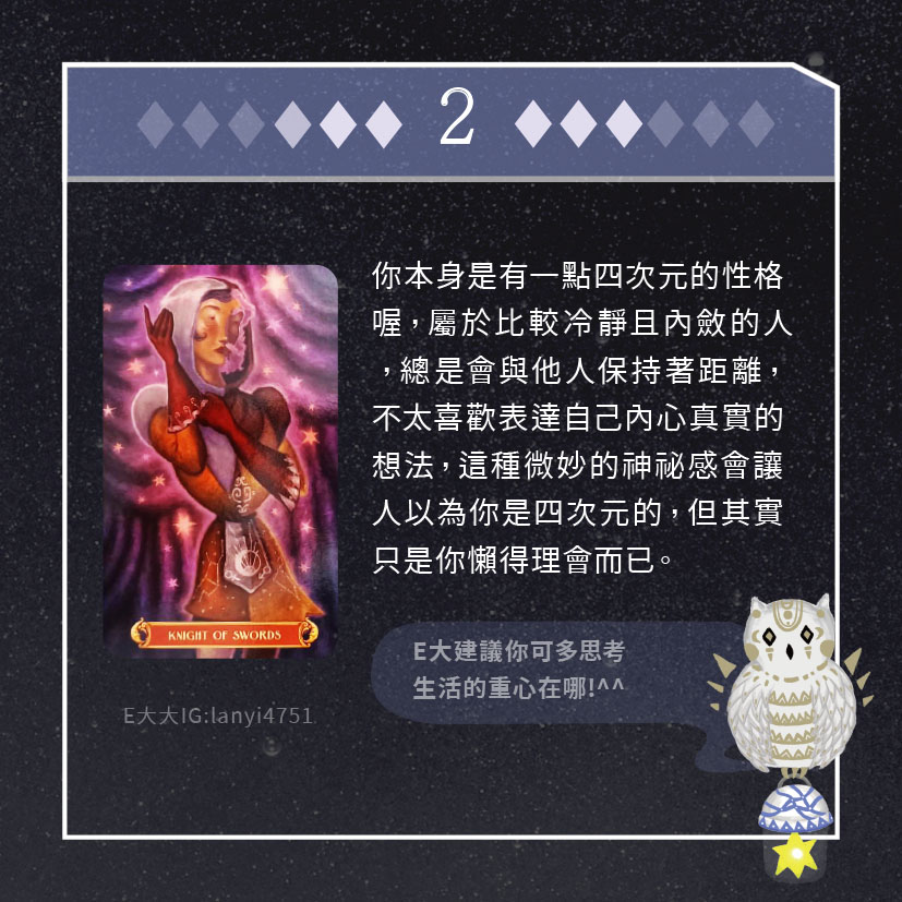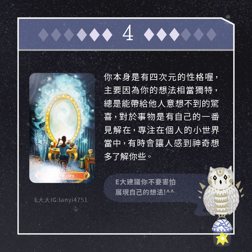 嗨~我是E大,歡迎你來到我的塔羅世界,每天會跟大家分享有趣的塔牌測驗,及塔羅知識喔!