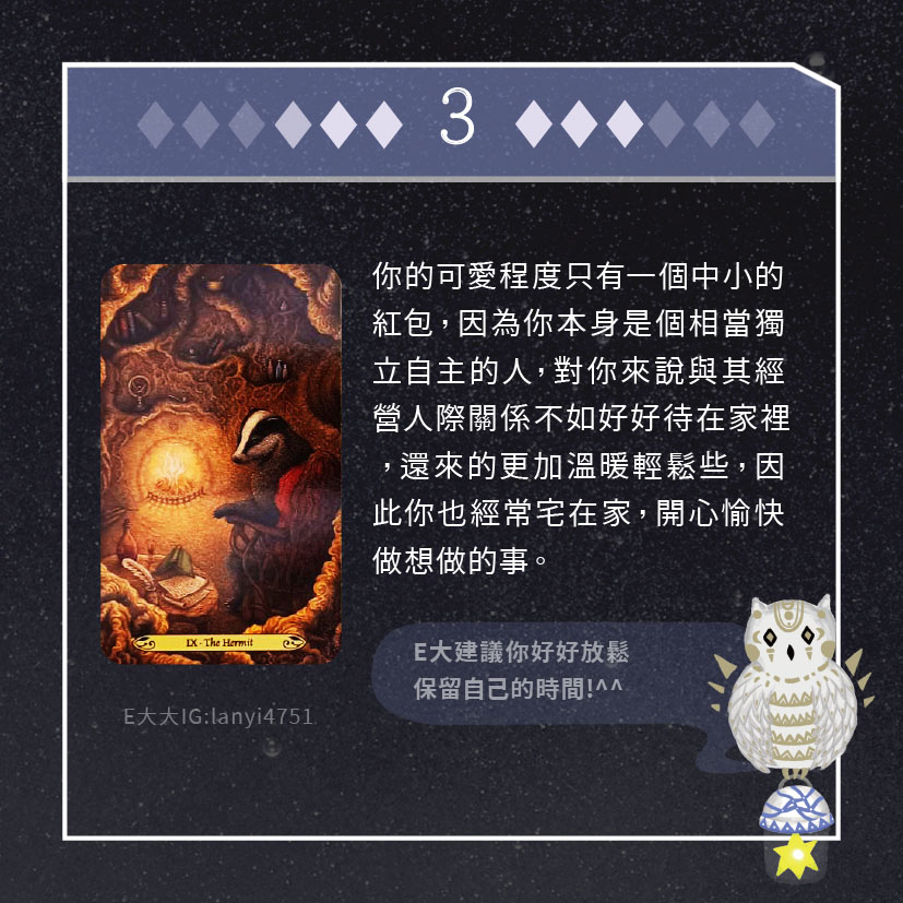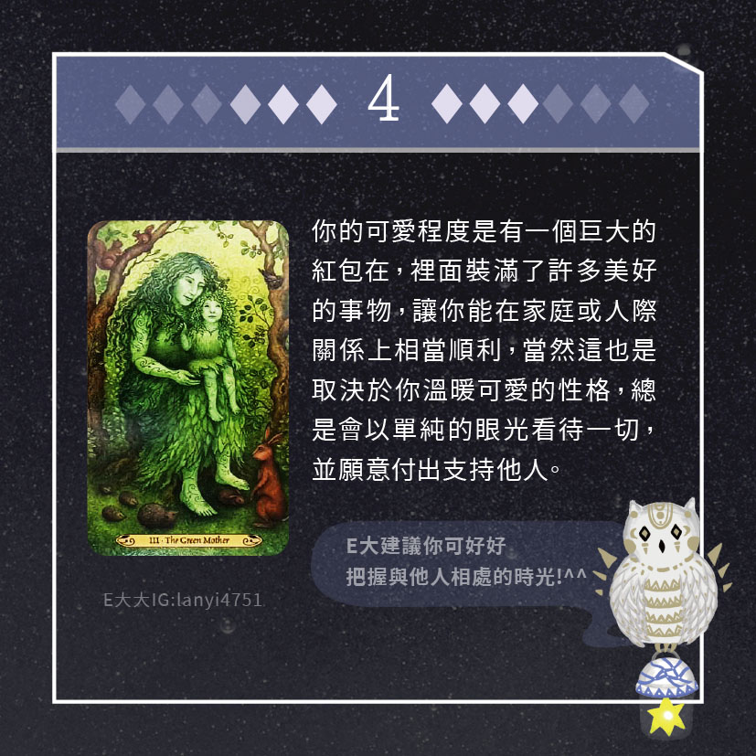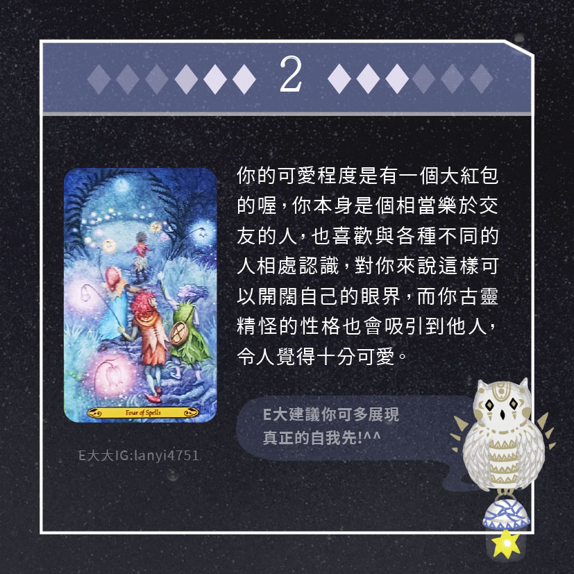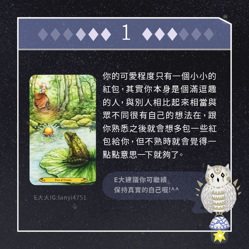 嗨~我是E大,歡迎你來到我的塔羅世界,每天會跟大家分享有趣的塔牌測驗,及塔羅知識喔!