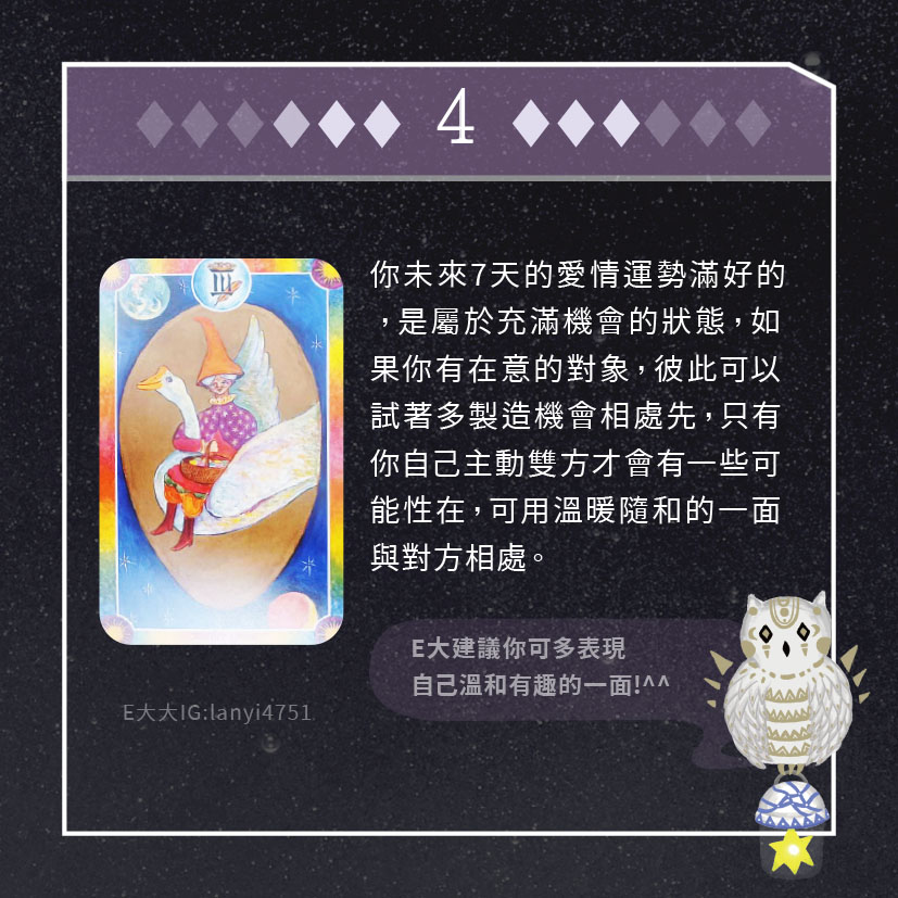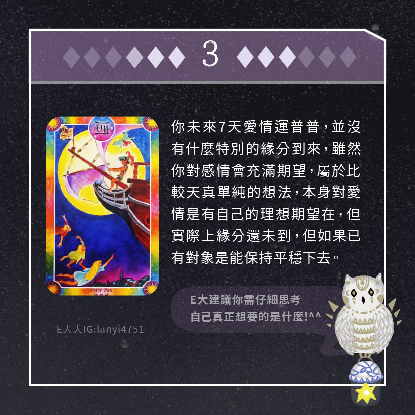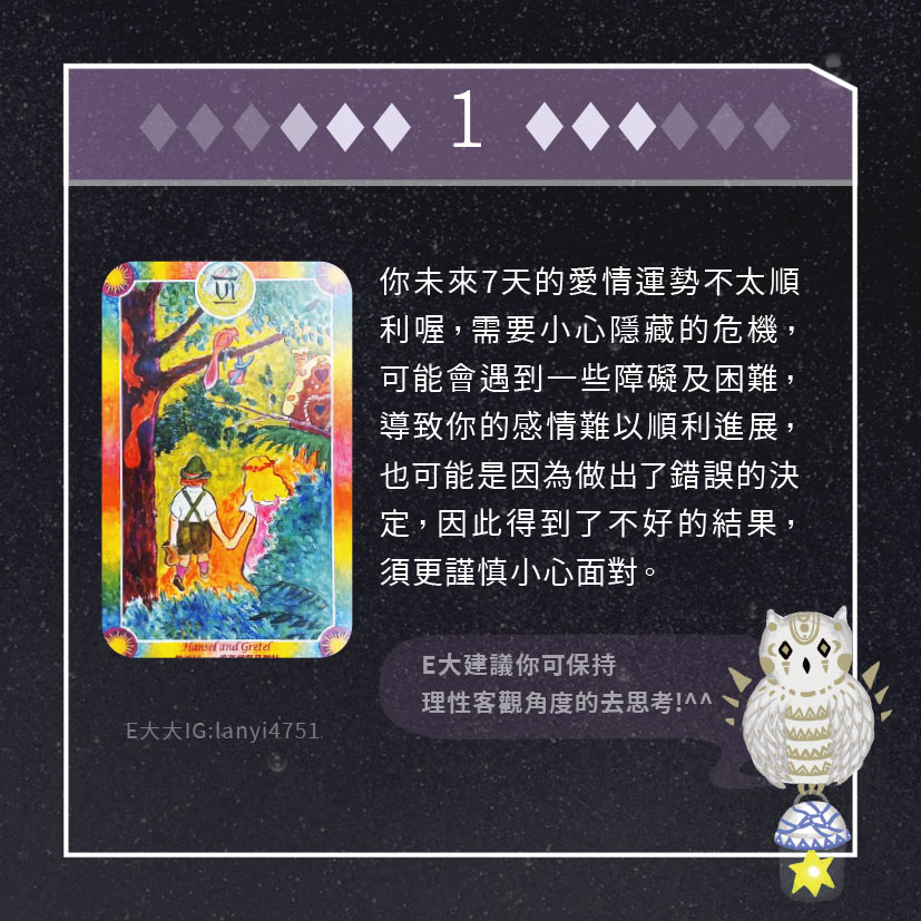 嗨~我是E大,歡迎你來到我的塔羅世界,每天會跟大家分享有趣的塔牌測驗,及塔羅知識喔!