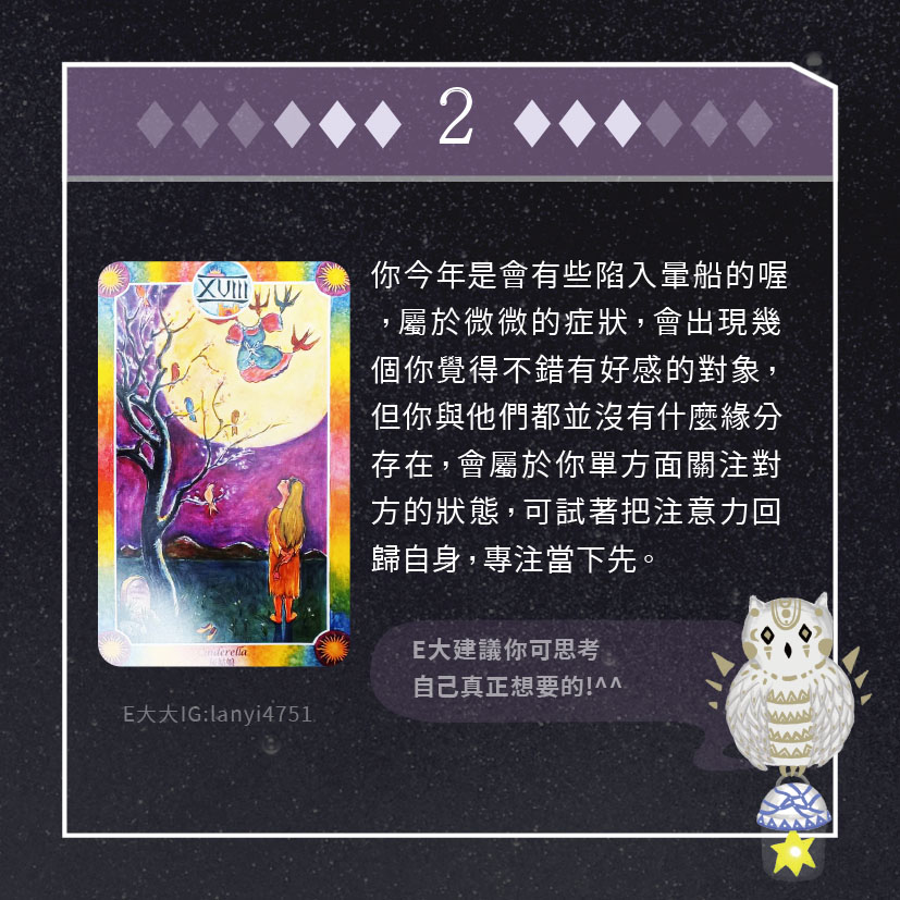 嗨~我是E大,歡迎你來到我的塔羅世界,每天會跟大家分享有趣的塔牌測驗,及塔羅知識喔!
