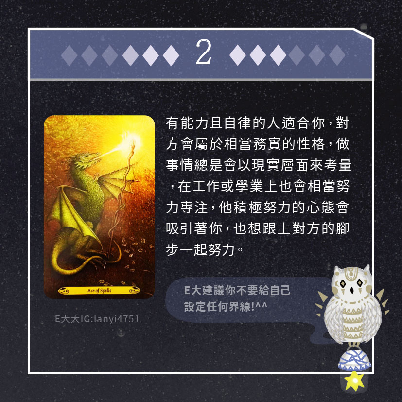 嗨~我是E大,歡迎你來到我的塔羅世界,每天會跟大家分享有趣的塔牌測驗,及塔羅知識喔!