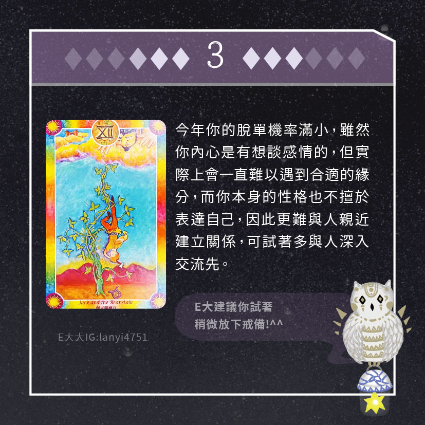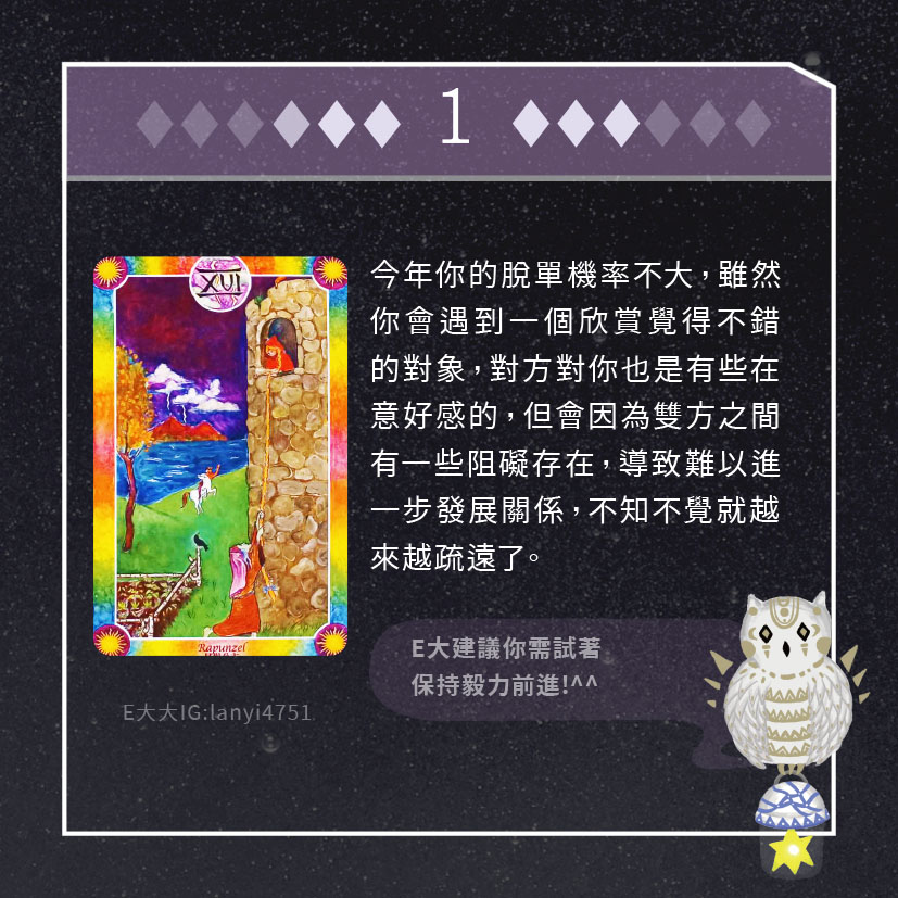 嗨~我是E大,歡迎你來到我的塔羅世界,每天會跟大家分享有趣的塔牌測驗,及塔羅知識喔!