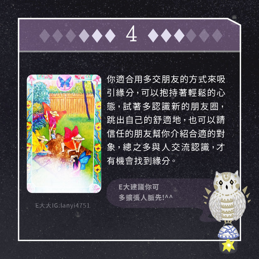 嗨~我是E大,歡迎你來到我的塔羅世界,每天會跟大家分享有趣的塔牌測驗,及塔羅知識喔!