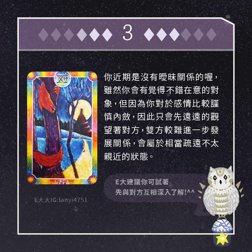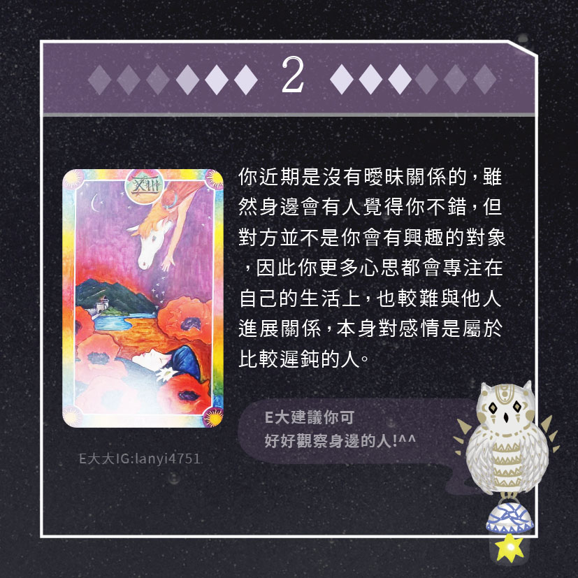 嗨~我是E大,歡迎你來到我的塔羅世界,每天會跟大家分享有趣的塔牌測驗,及塔羅知識喔!