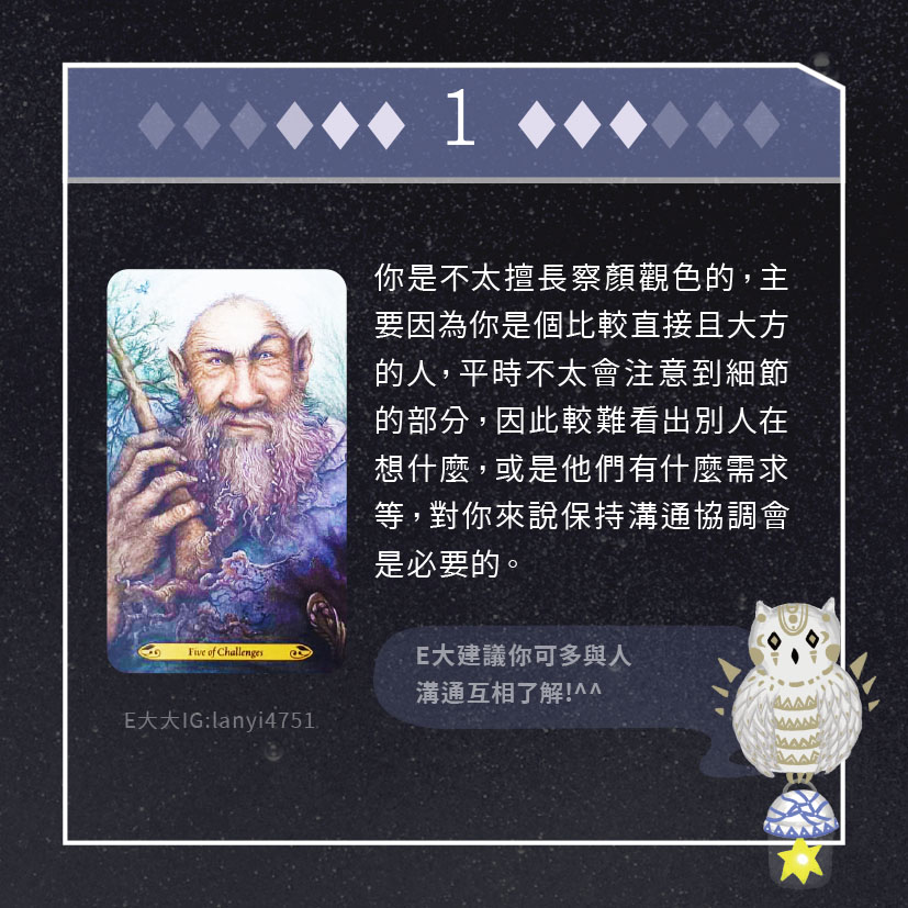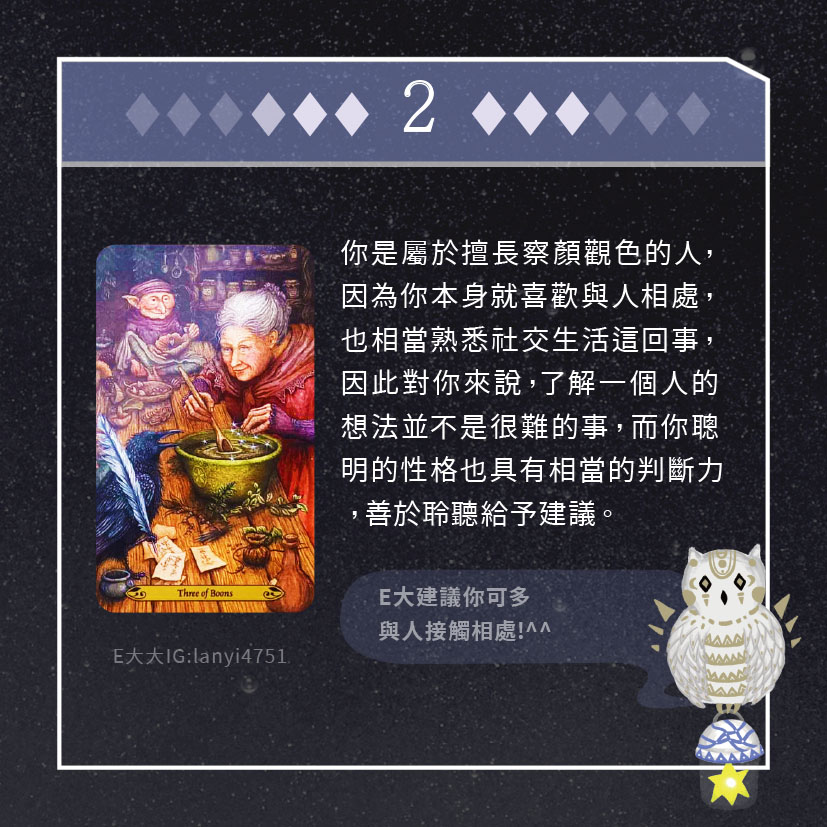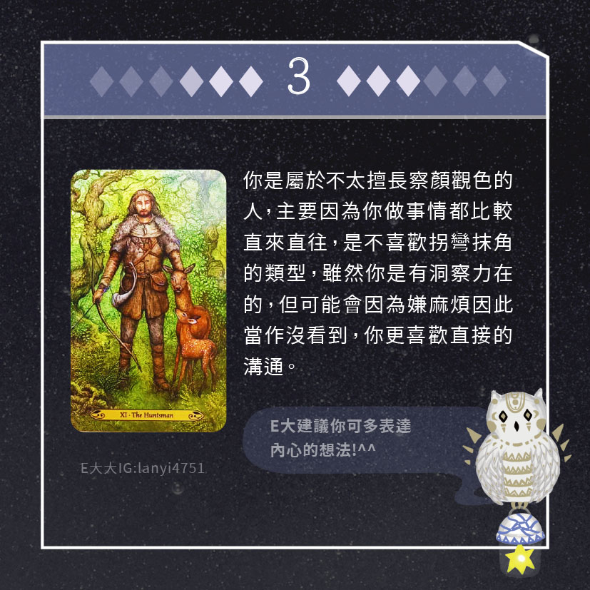 嗨~我是E大,歡迎你來到我的塔羅世界,每天會跟大家分享有趣的塔牌測驗,及塔羅知識喔!