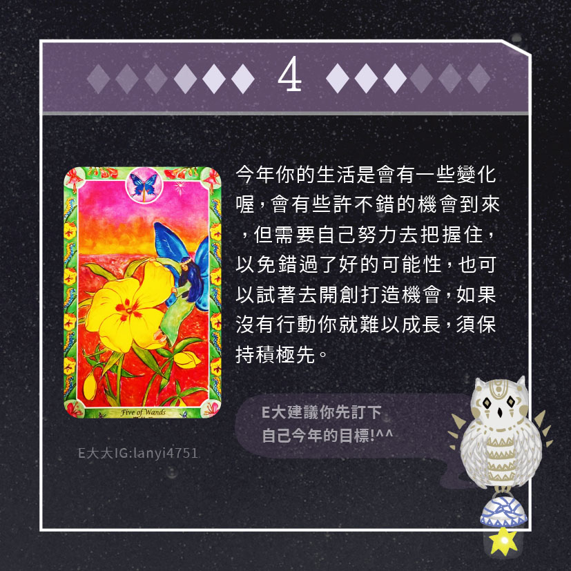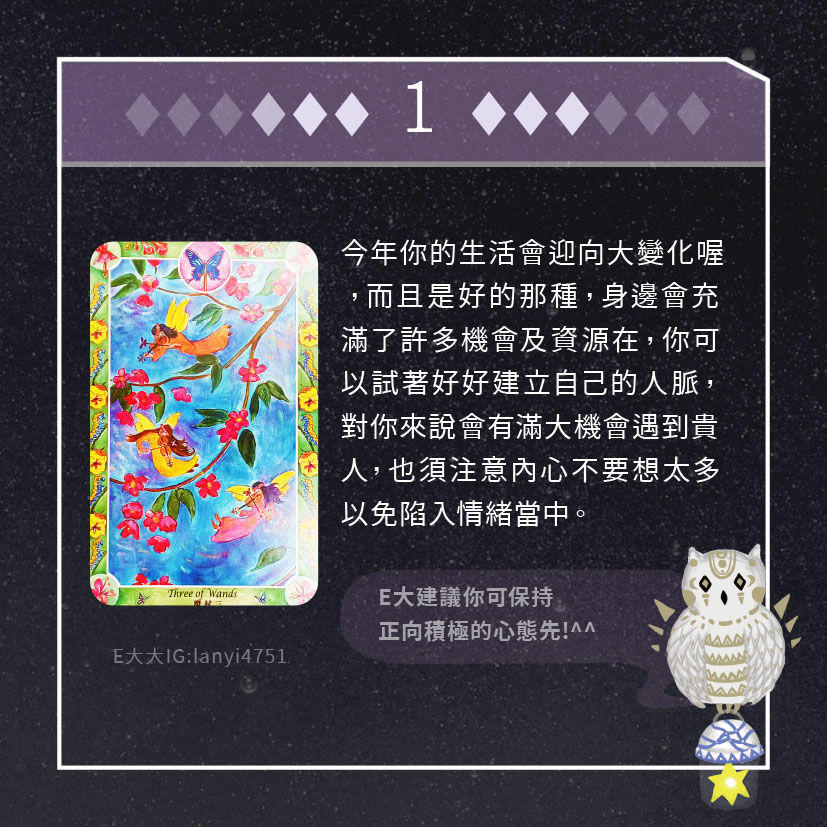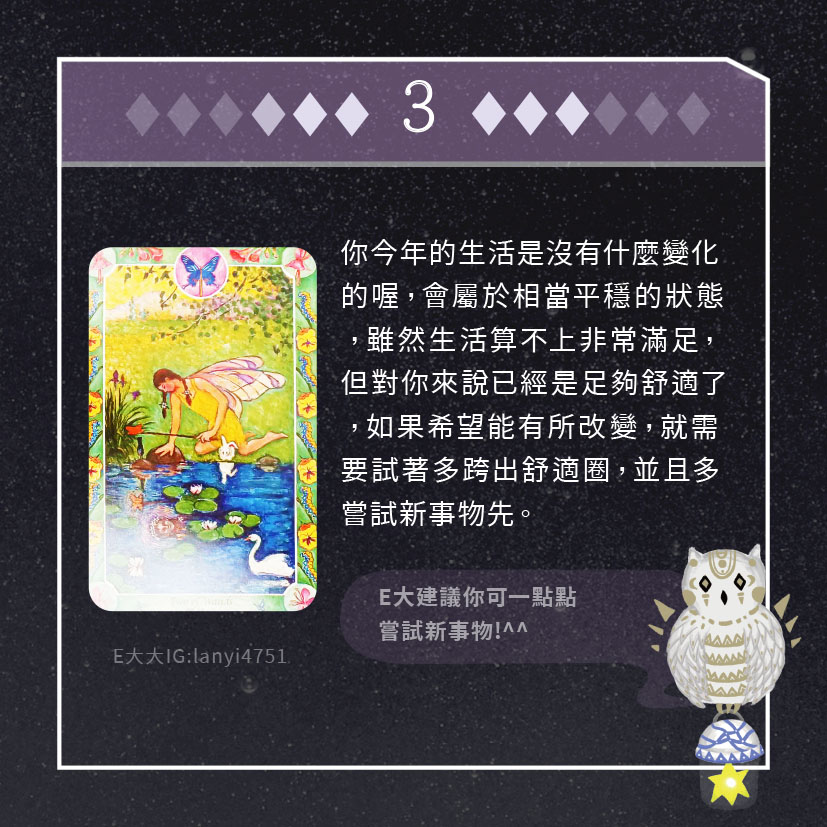 嗨~我是E大,歡迎你來到我的塔羅世界,每天會跟大家分享有趣的塔牌測驗,及塔羅知識喔!