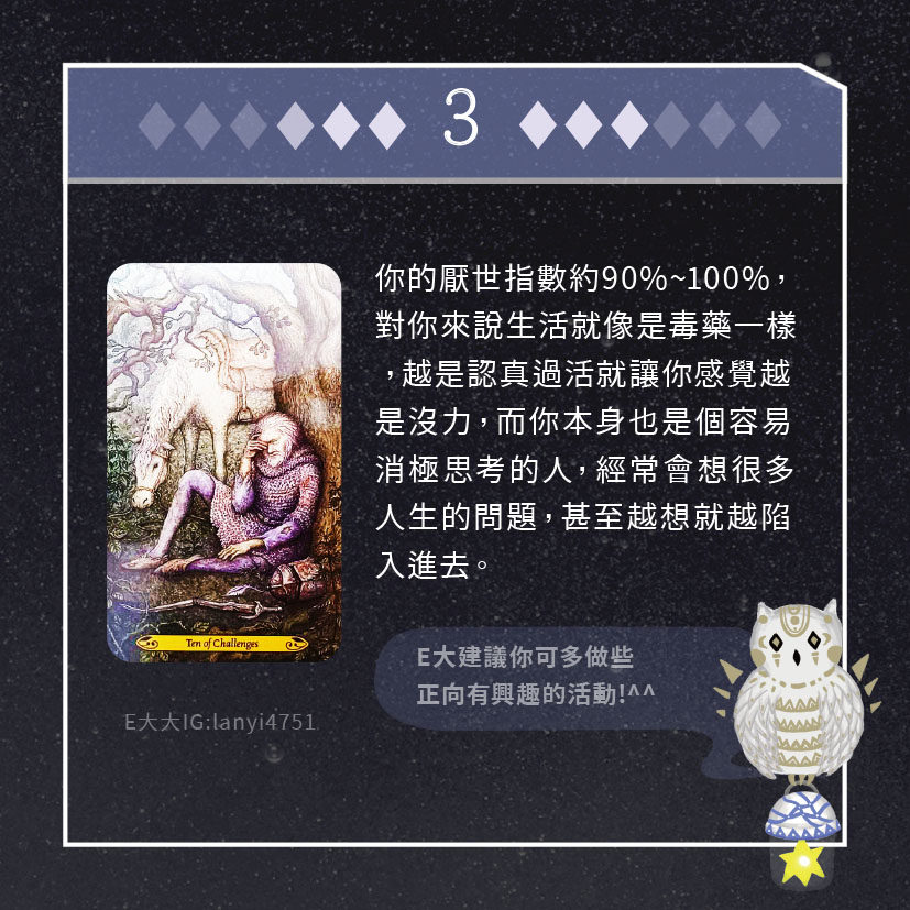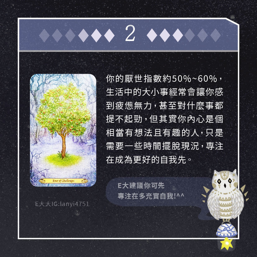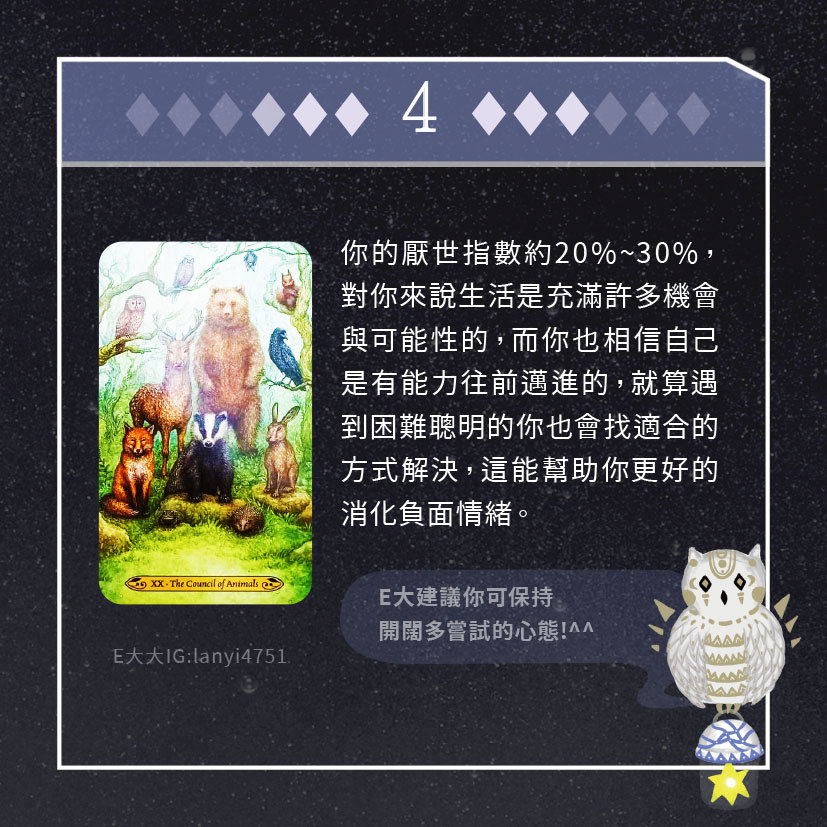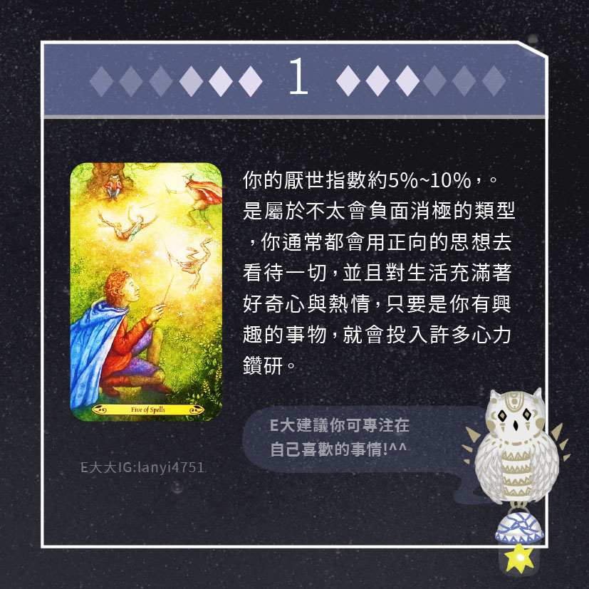 嗨~我是E大,歡迎你來到我的塔羅世界,每天會跟大家分享有趣的塔牌測驗,及塔羅知識喔!