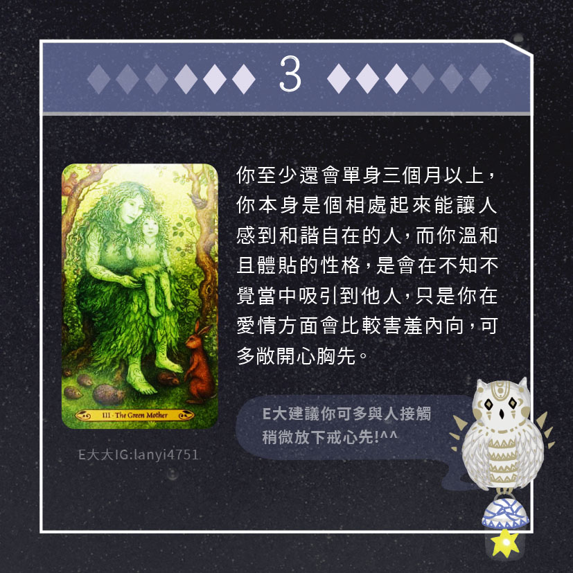 嗨~我是E大,歡迎你來到我的塔羅世界,每天會跟大家分享有趣的塔牌測驗,及塔羅知識喔!