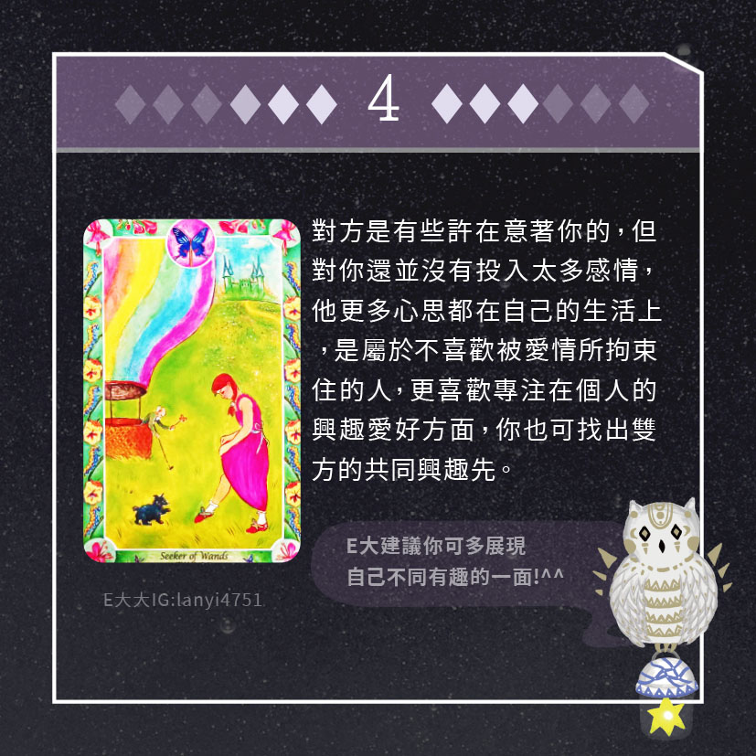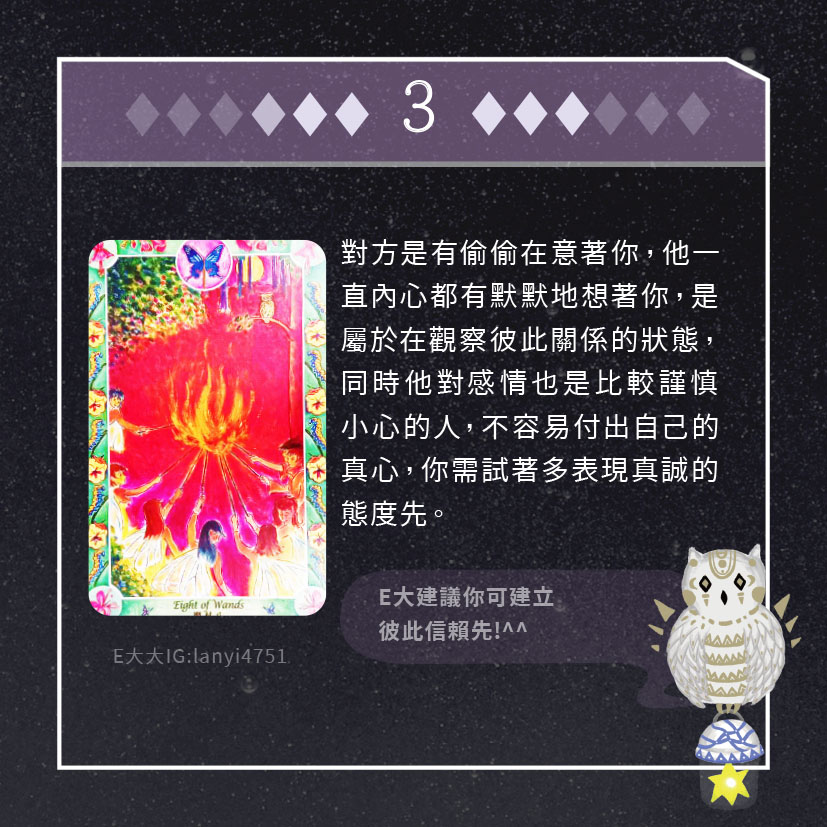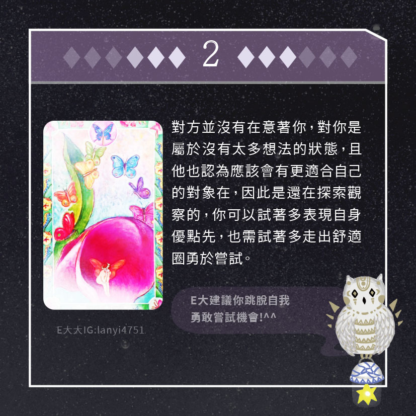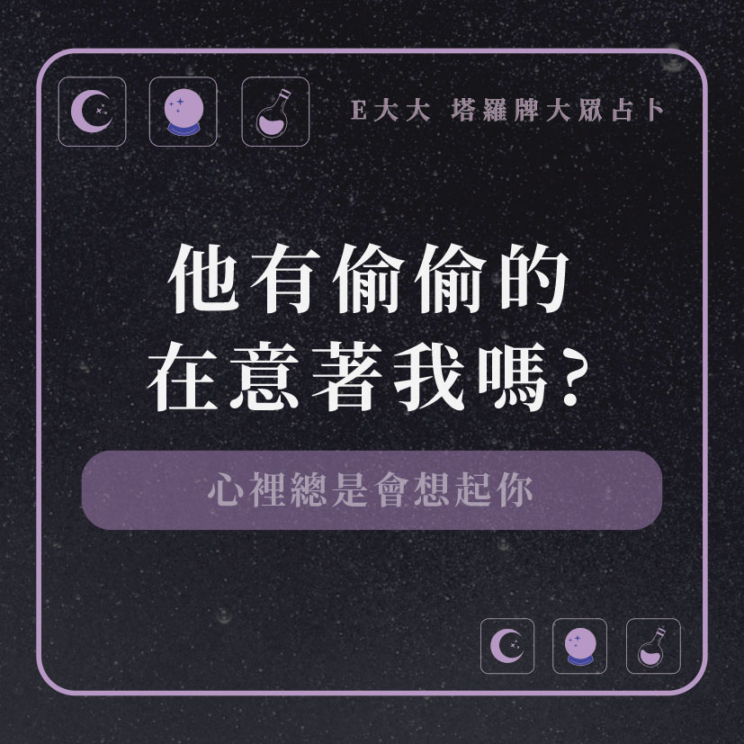 嗨~我是E大,歡迎你來到我的塔羅世界,每天會跟大家分享有趣的塔牌測驗,及塔羅知識喔!