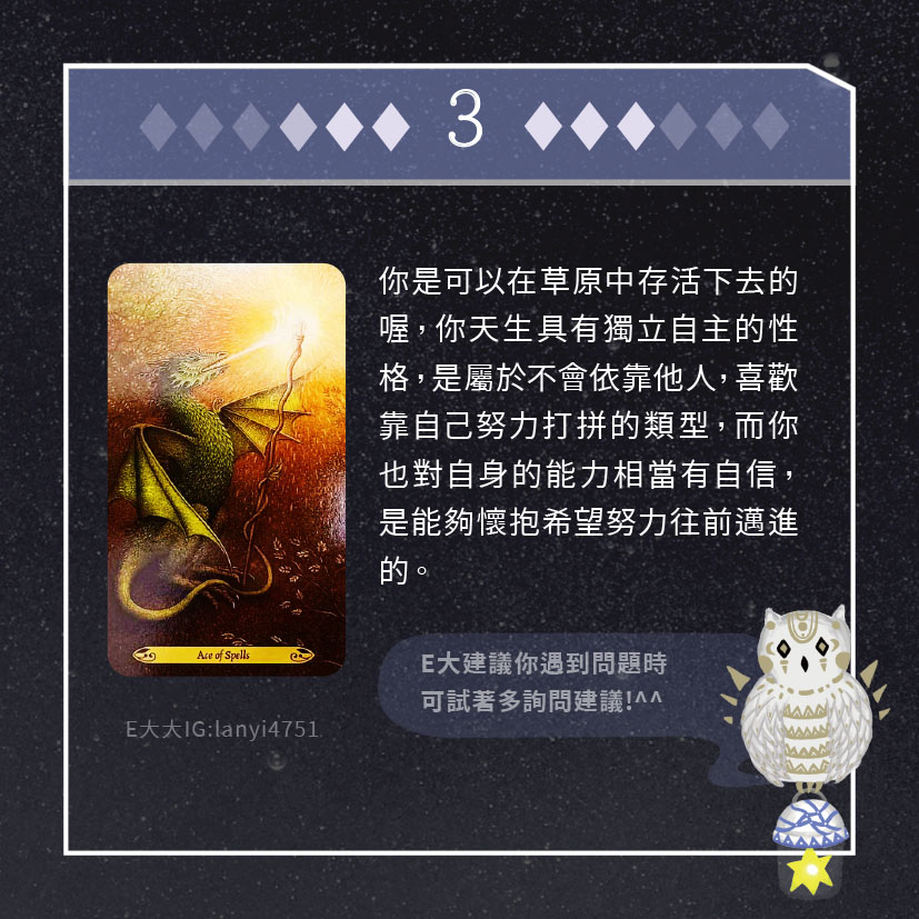 嗨~我是E大,歡迎你來到我的塔羅世界,每天會跟大家分享有趣的塔牌測驗,及塔羅知識喔!